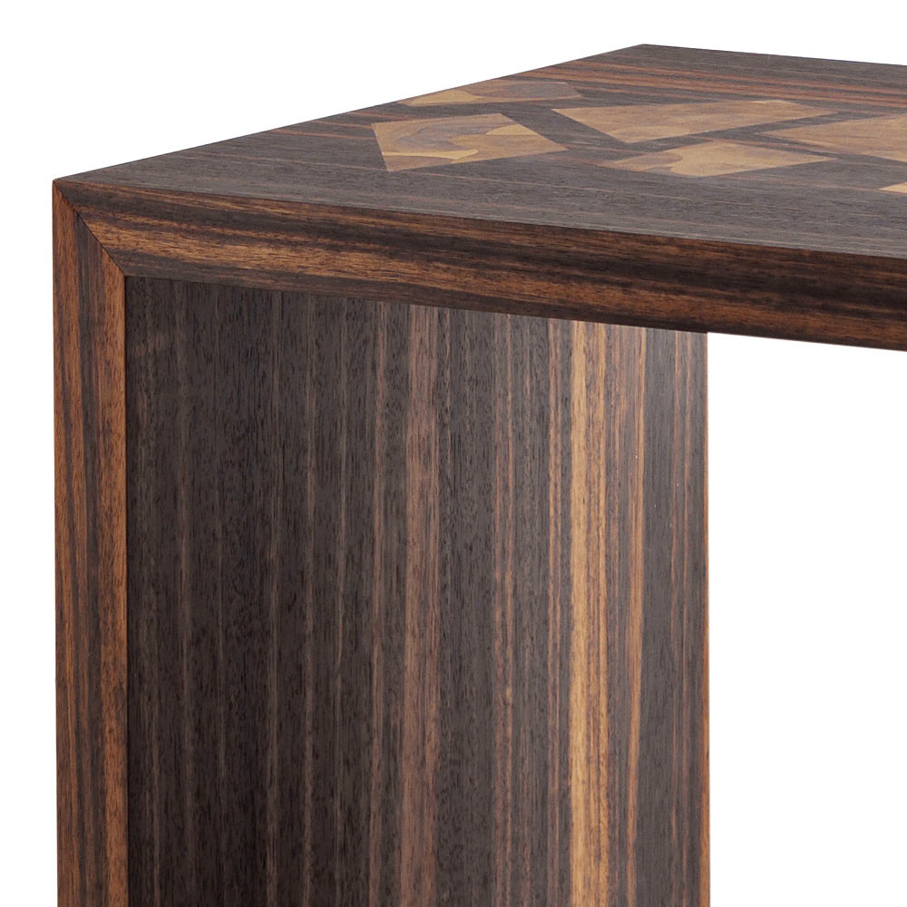 Dess struktur är i ebenholt fanerade träfaner och valnötrotade carganelloinsatser.