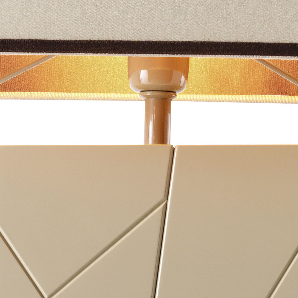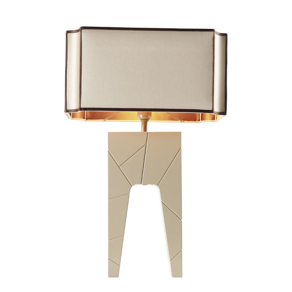 Zarafa-lampan har en solidlackerad massivt trästruktur, valt mellan två beige och svarta färger med en tyghatt.