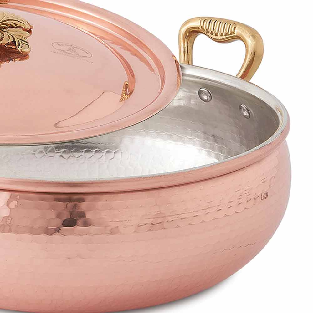 Rundat grönsaksfat i hamrad koppar med handtag och lock, tillverkat i Italiens hantverk.