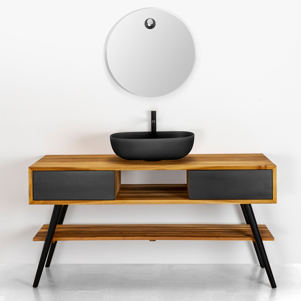 Badrumsmöbelkomposition med rund spegel och handfat i svart harts.
