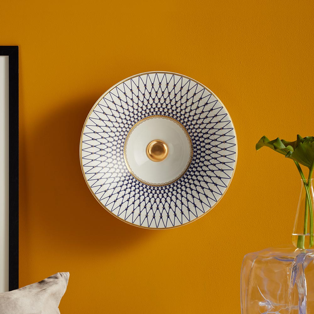 - invändig blå capitonnée reliefdekor på vit emalj, utvändig vit emalj