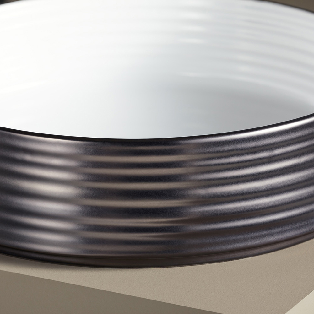 - Glänsande vit insida, matt pistol svart exteriör
