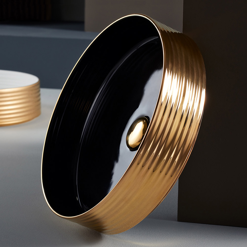 - Glänsande svart insida, glänsande guld exteriör