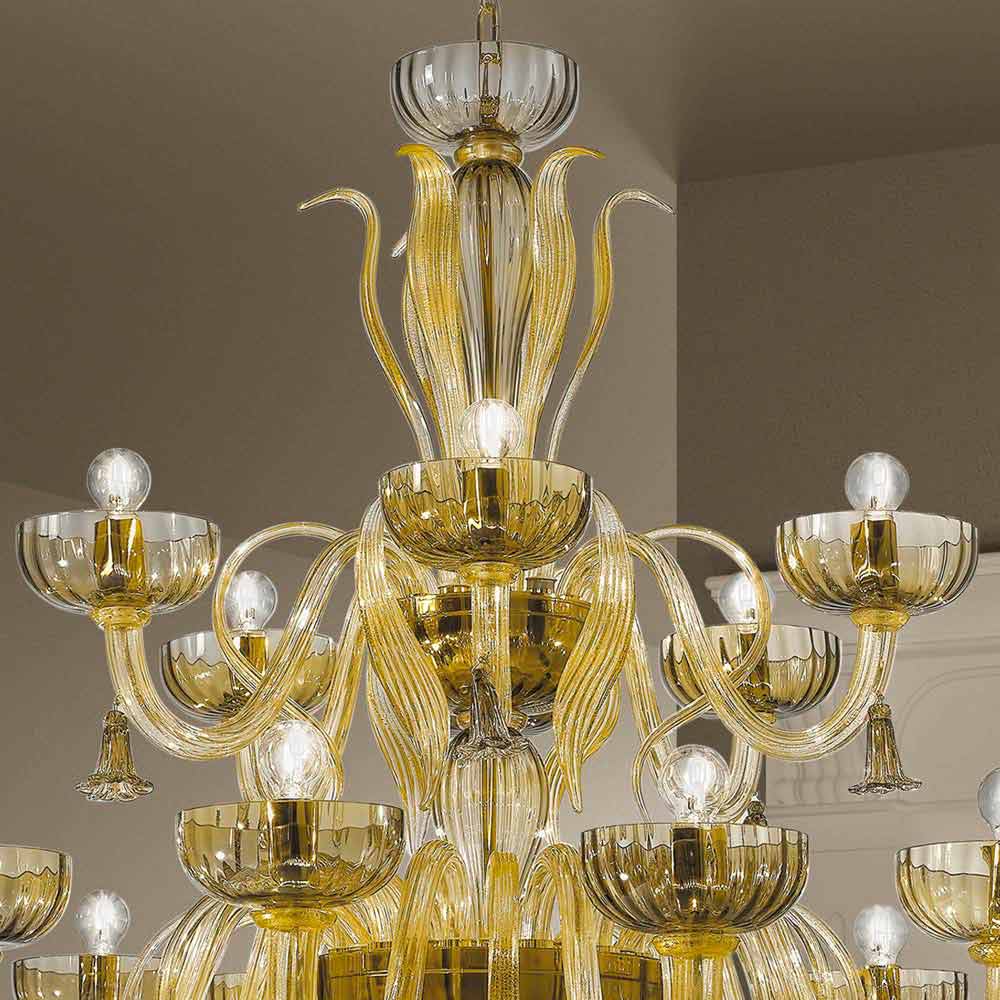 Klassisk ljuskrona tillverkad i Italien i Venedig i handbearbetat rökt finishglas med element i 24 karat guld applicerat varmt under bearbetning och detaljer i glänsande guldmetall . Från en obsessiv uppmärksamhet på detaljer och Vertrai-mästarnas enorma passion, föddes en möbleringslösning med en imponerande personlighet som erövrar alla utrymmen tack vare dess stora dimensioner och den underbara kombinationen av utvalda ytor. Touchen av guld ökar dess värde ännu mer och ger liv till ett riktigt konstverk .