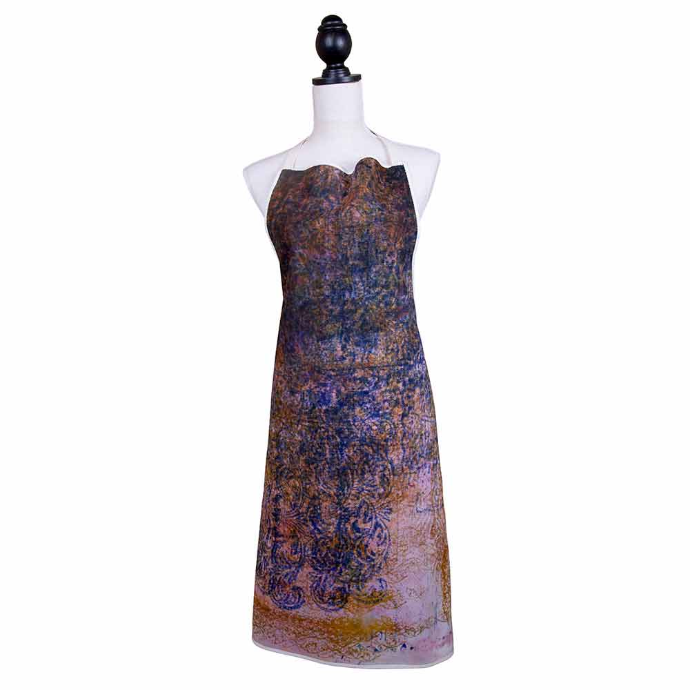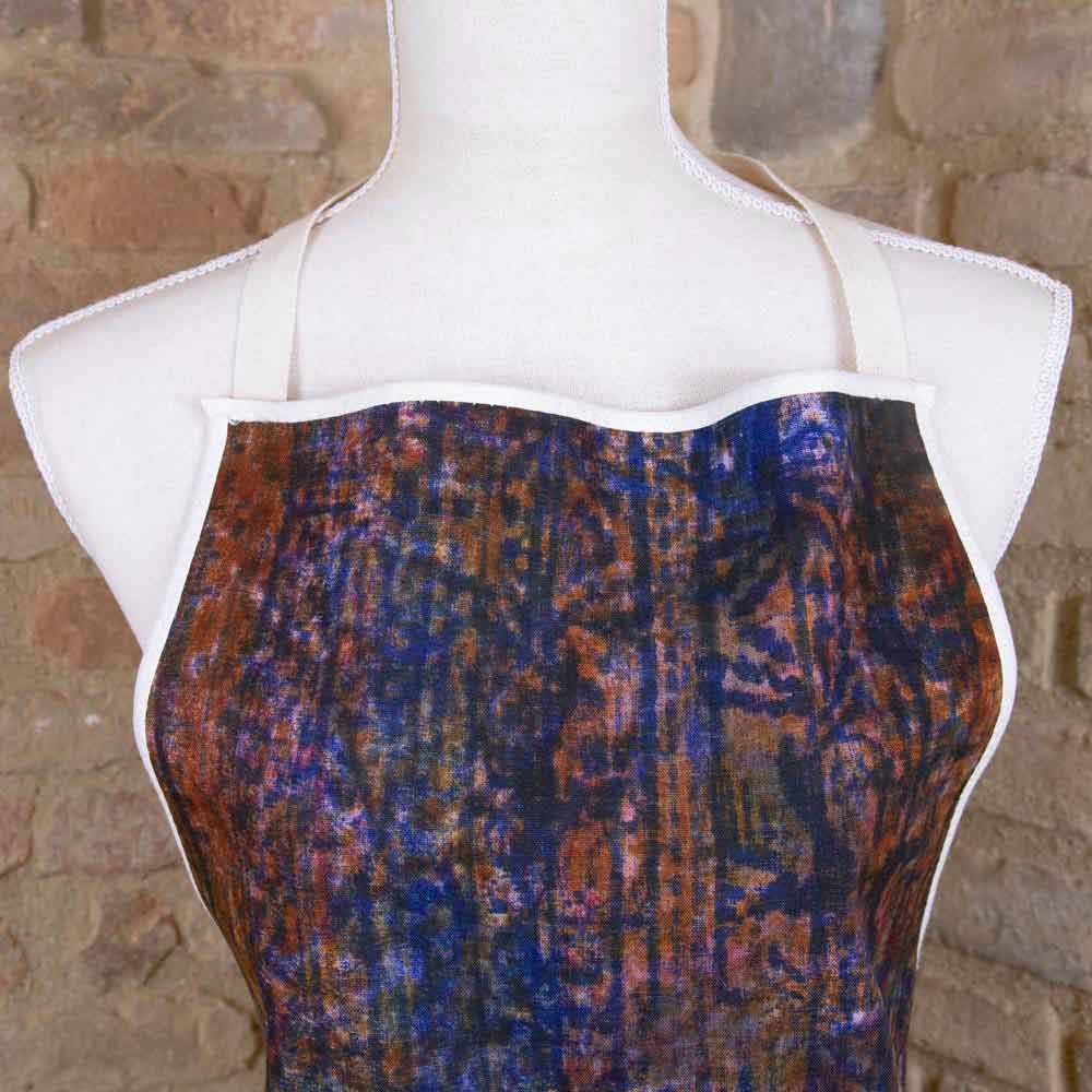 Högt hantverkskökförkläde med smeksa i ren bomull dekorerad med färgade konstnärliga motiv tryckt för hand, unik kvalitetsbit tillverkad i Italien.