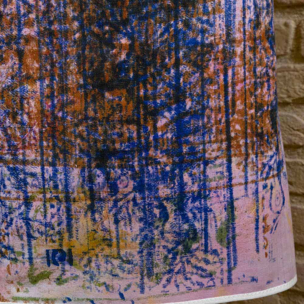 6. Handtryck : Denna fas varar i månader. Tyget placeras på arbetsbänken under de olika artiklarna som i månader och månader av arbete kommer att växla och tryckas. De olika färgerna och designen kommer att överföras "spontant" till detta tyg på grund av träformens tryck och kommer att överlappa varandra. Slutresultatet blir en explosion av oförutsägbara och oupprepbara färger och nyanser.