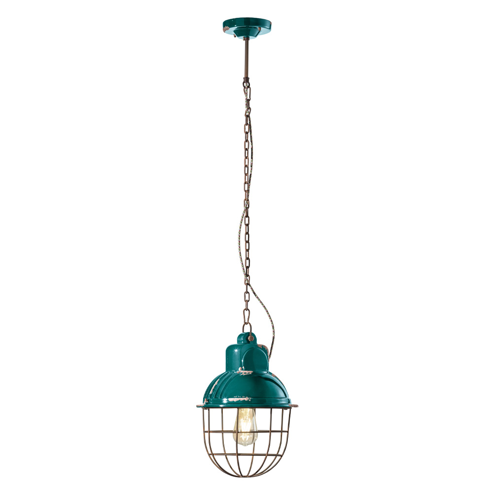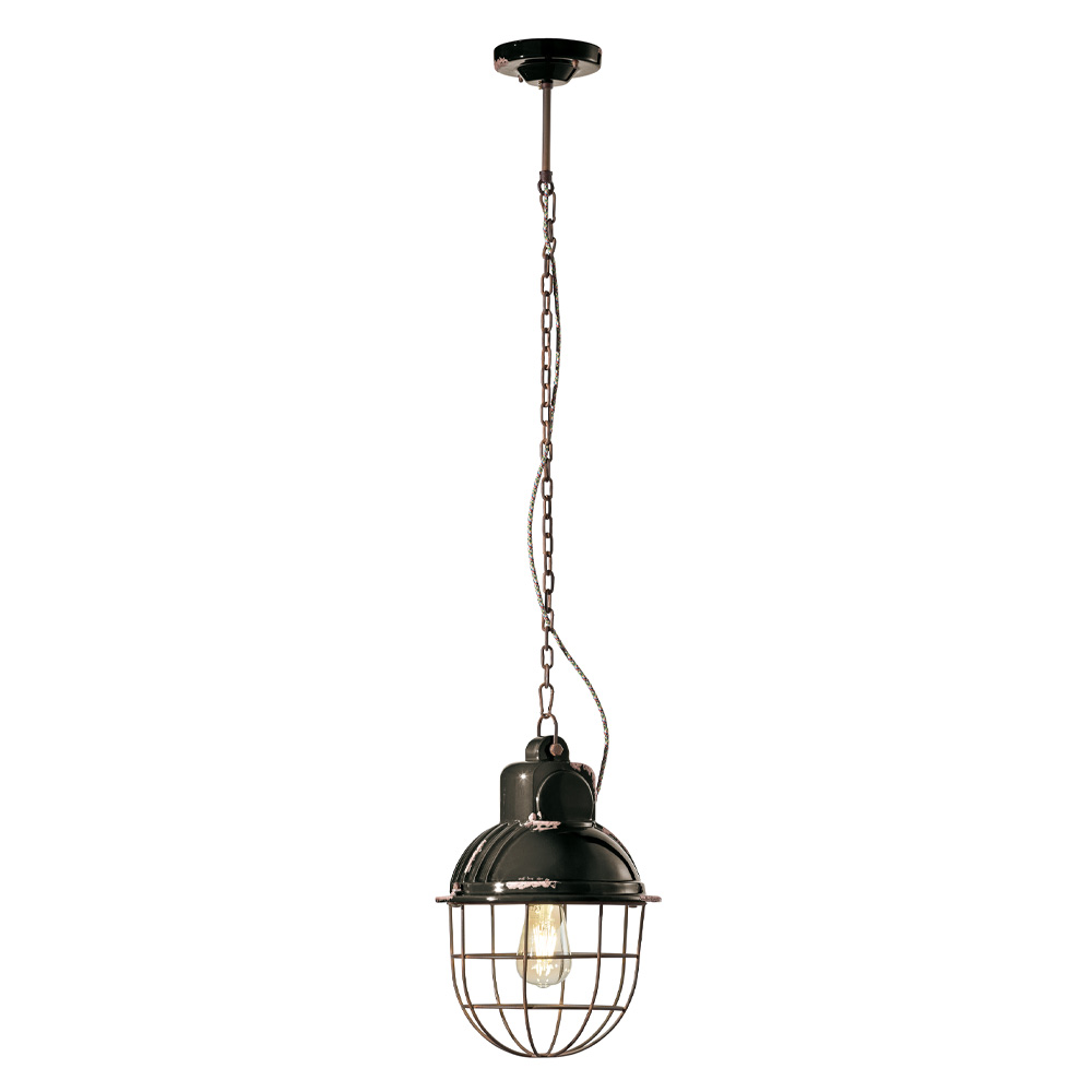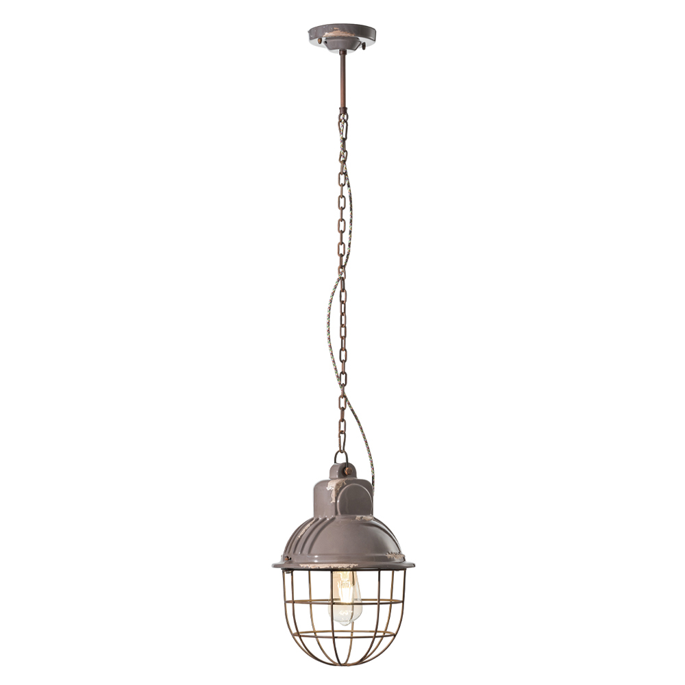 Upphängd lampa i keramik och järn med galler, olika industriella ytbehandlingar tillverkade i Italien av Ferroluce.