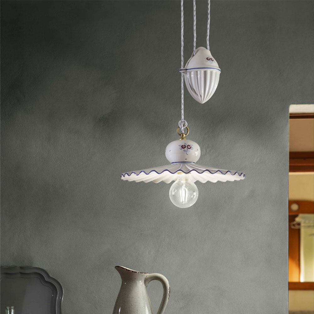 Denna pendellampa med spärrar den är helt handgjord i metall och keramik med handmålad dekor, för att lyfta fram hantverkarnas mästerskap och manuella färdigheter.