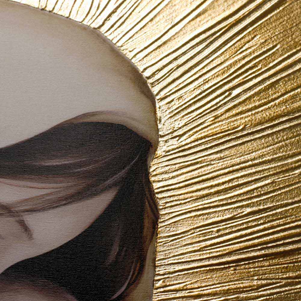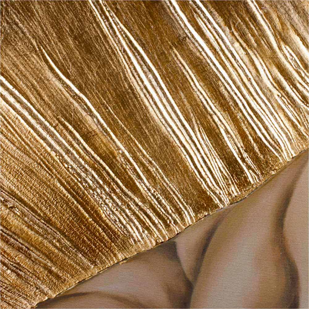 Dekorerad för hand med upphöjt material och guldblad på dukstruktur.