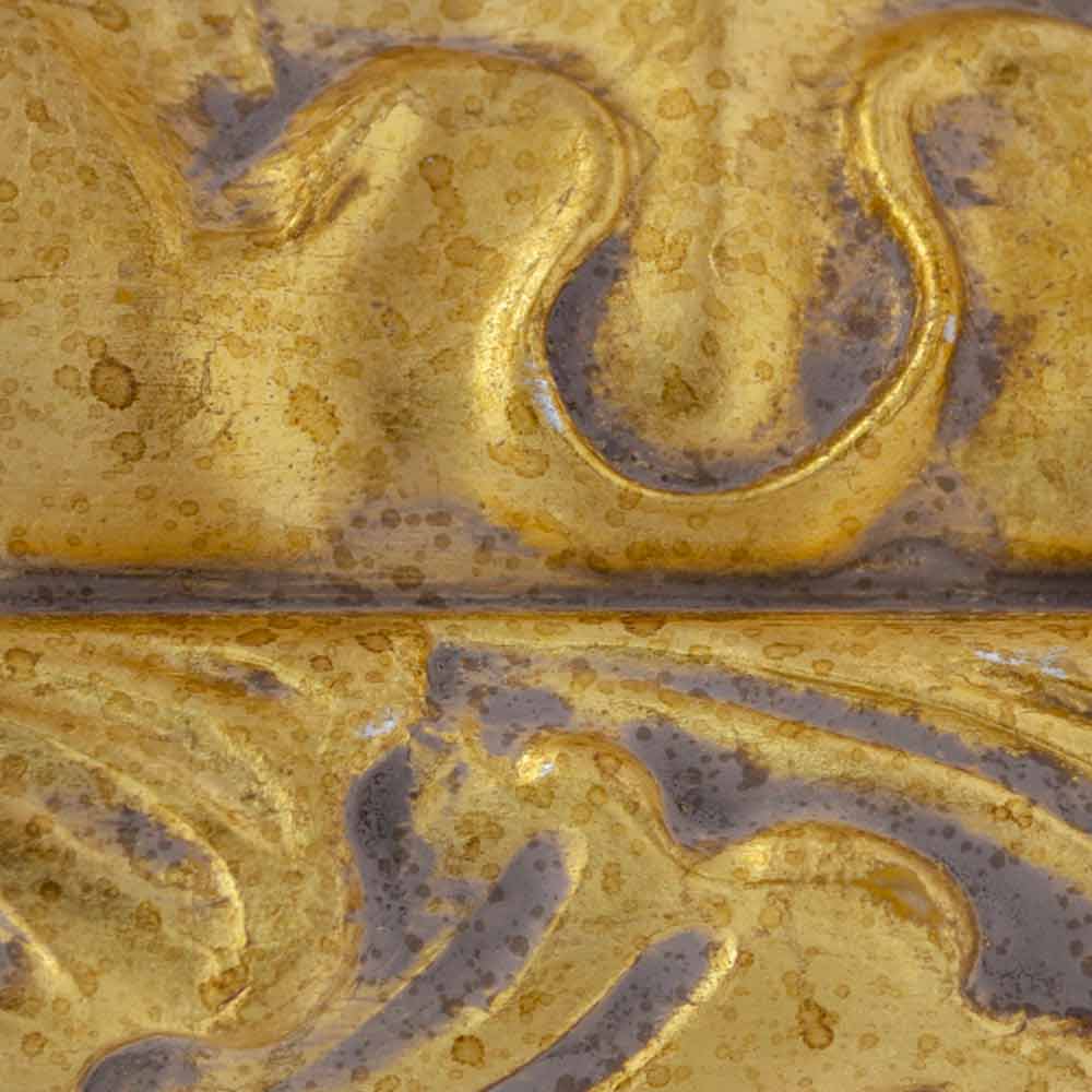 Denna eleganta spegel är ett designmästerverk som kombinerar funktionalitet och dekorativ stil . Ramen är fint utformad med sammanflätade blommotiv och smälter perfekt in i den moderna blommiga bakgrunden som den är placerad på, vilket skapar en visuellt stimulerande kontrast. Hantverket märks i varje detalj , från det delikata spelet av ljus och skugga som finishen erbjuder, till precisionen i gravyrerna som dekorerar kanterna.