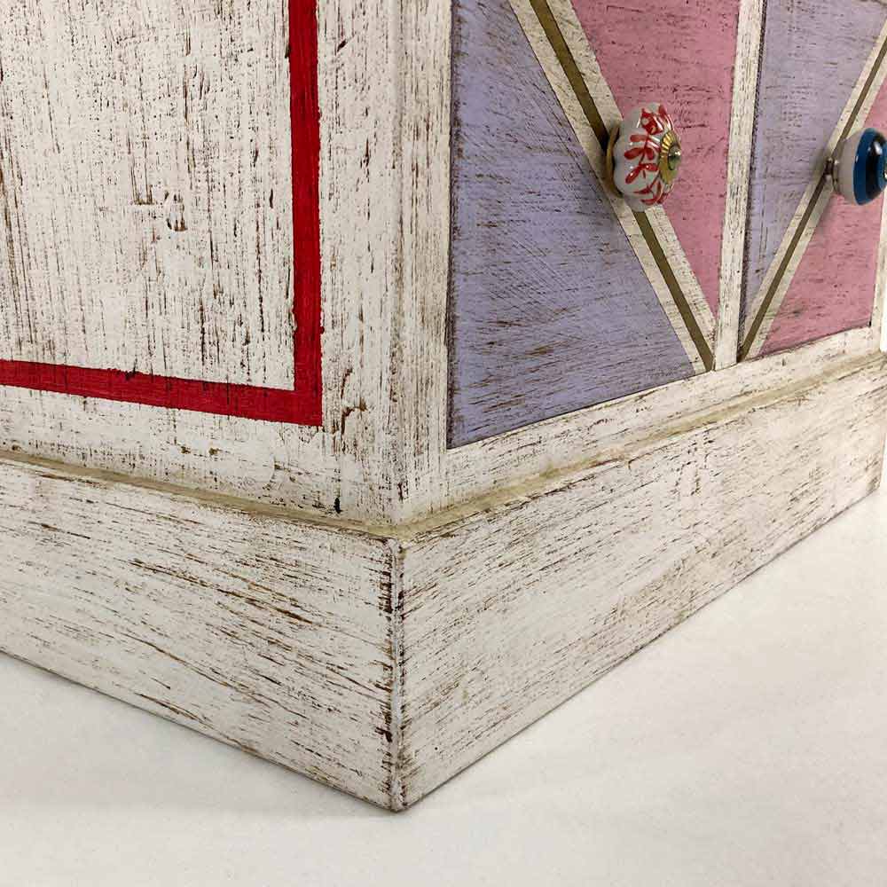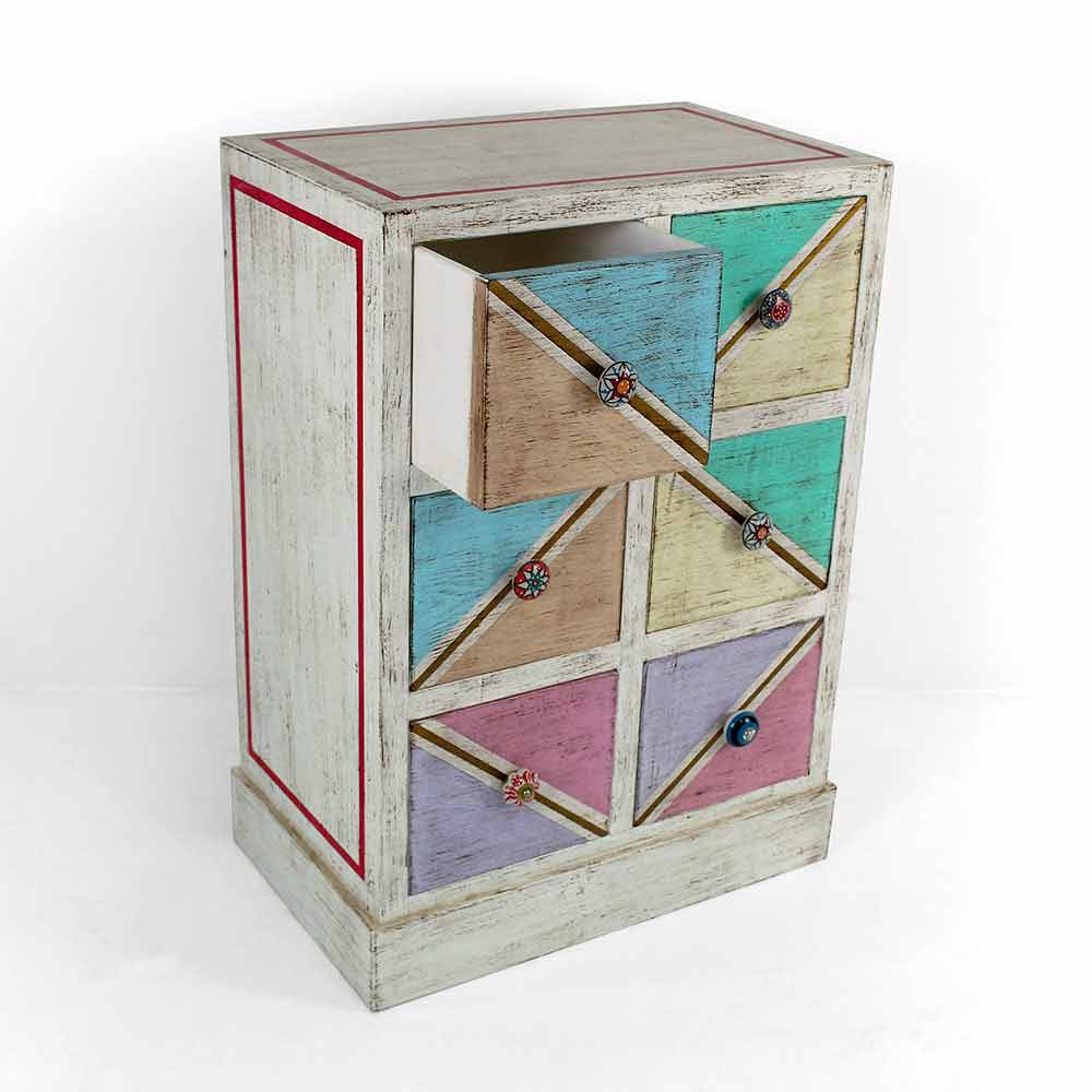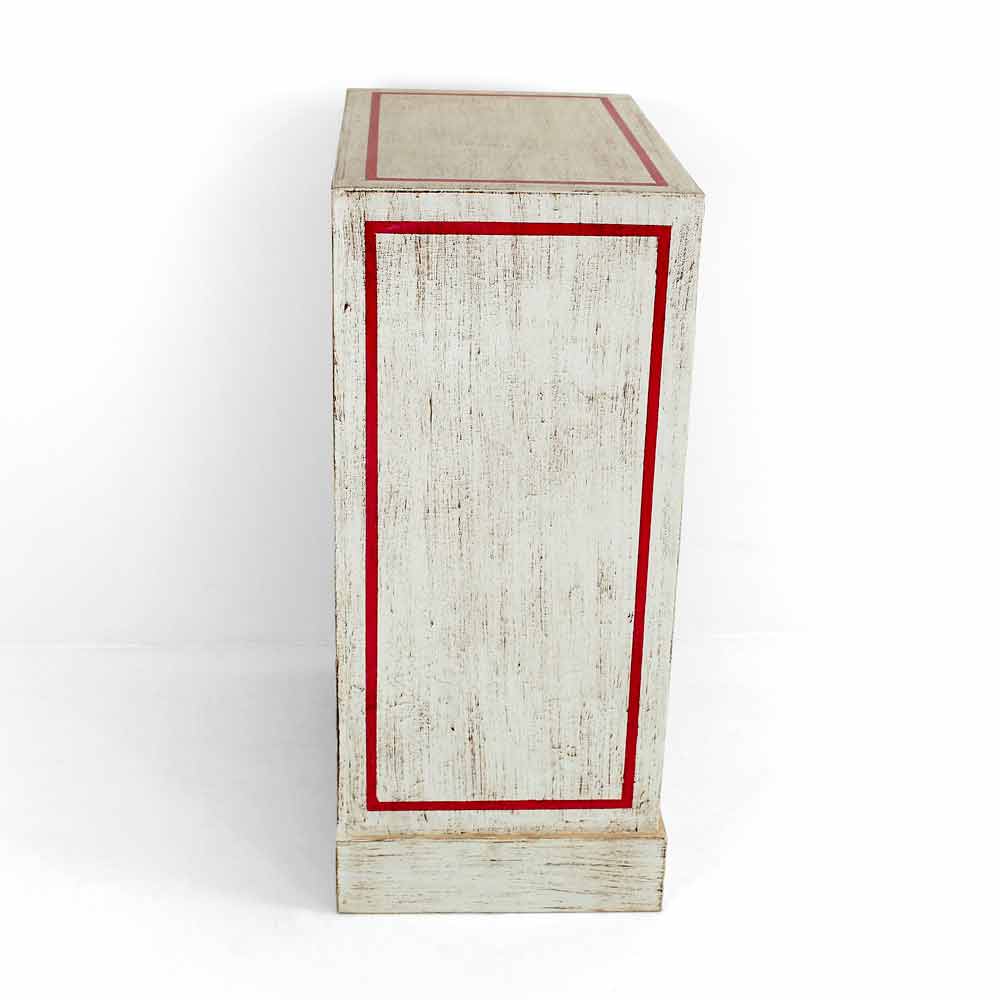 Byrå handgjord i Italien med struktur i massivt trä och åldrad vit yta och 6 lådor i poppelplywood med träpanel målad i diagonalt mönster och detaljer i antikt guld och rött. Produkten är klar med en genomskinlig yta som gör den vattenavvisande och fixerar färgerna för att göra dem oföränderliga över tiden.
