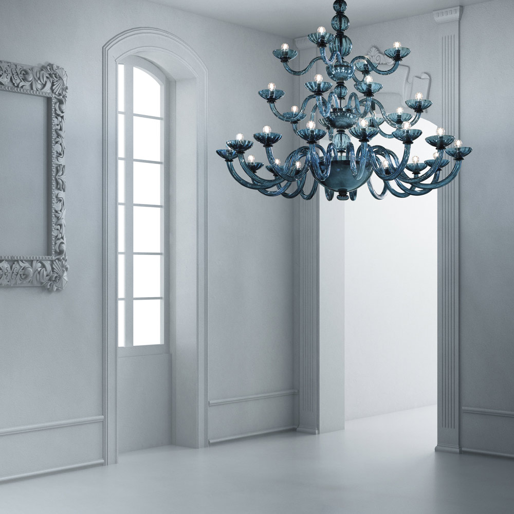 Handgjord 28-ljus ljuskrona av denimfinish Venedigglas med blyhängen och detaljer i polerad kromad metall . En möbel med en fantastisk och ikonisk närvaro som kännetecknas av en mjuk och delikat linje och raffinerade kurvor som anpassar sig perfekt till klassiska miljöer men samtidigt också till utrymmen med en modern stil. Traditionselementet präglas av sina fantastiska komponenter i helt handgjort blåst glas som förvandlas för att uppdatera sig själv tack vare trendiga färger. Dess omslutande former gör den till ett idealiskt element för att ockupera alla miljöer, både hemmet och kontraktet, med klass och dynamik .