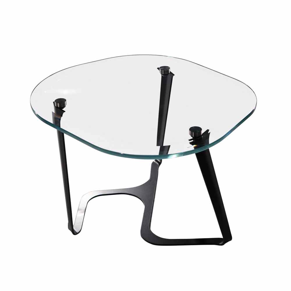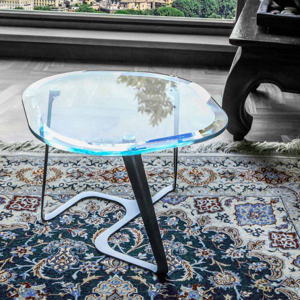 Raffinerat soffbord handgjord i Italien med genomskinlig härdat glasskiva och lackerad stålkonstruktion.