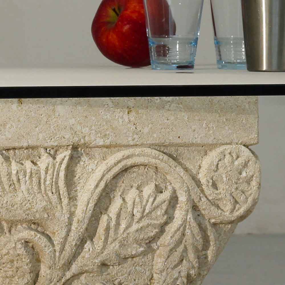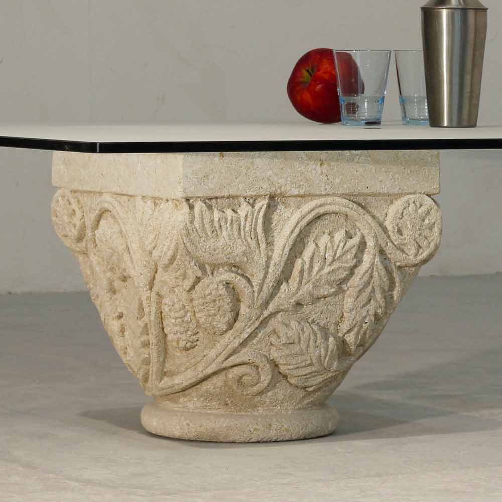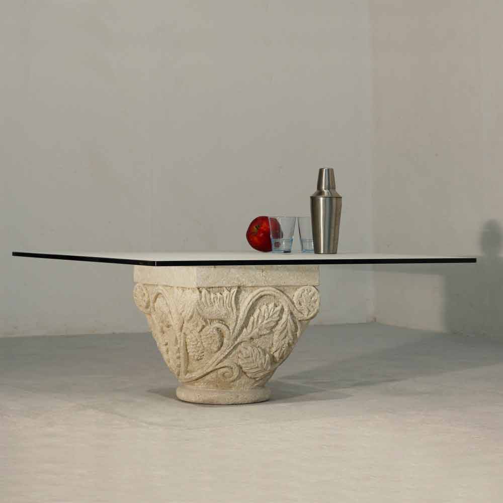 Classic kvadratisk soffbord Made in Italy med central bas i naturliga Vicenza sten, huggen för hand från det fasta kvarteret och med en 12 cm tjock float glas topp som vilar på basen.