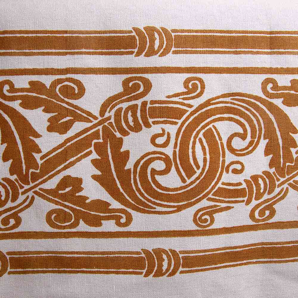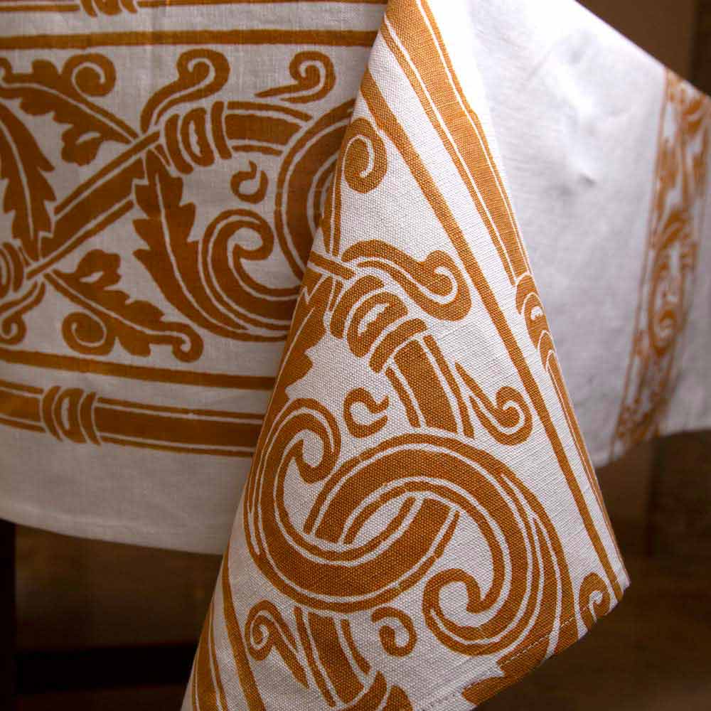 Mycket tillverkad italiensk linne och bomullsduk tillverkad med fint och konstnärligt handtryck i rostfärg längs kanterna och mitten, handarbete på exklusiva antika tyger tillverkade i Italien.