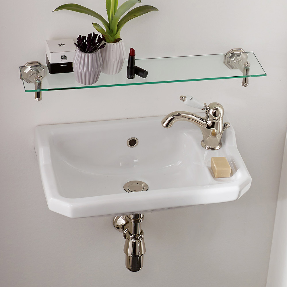 Raffinerad och elegant vägghängd tvättställ, redo för en kranhål i sidohylsan, L 500 mm. Den här artikeln