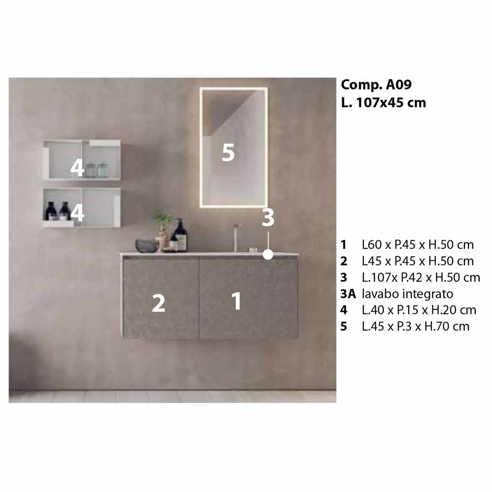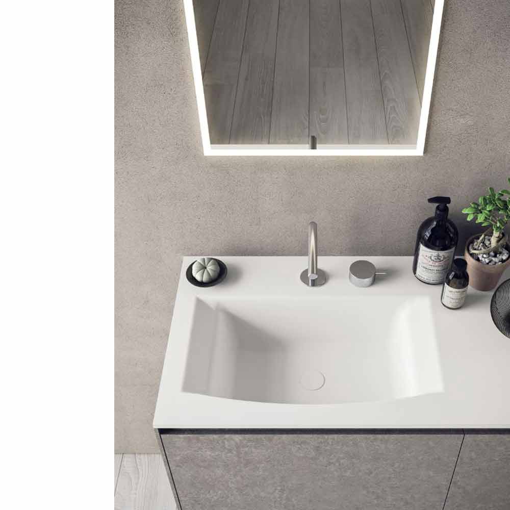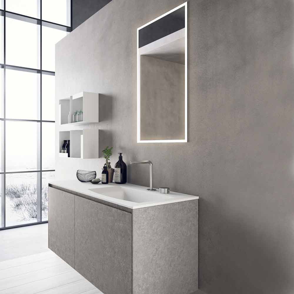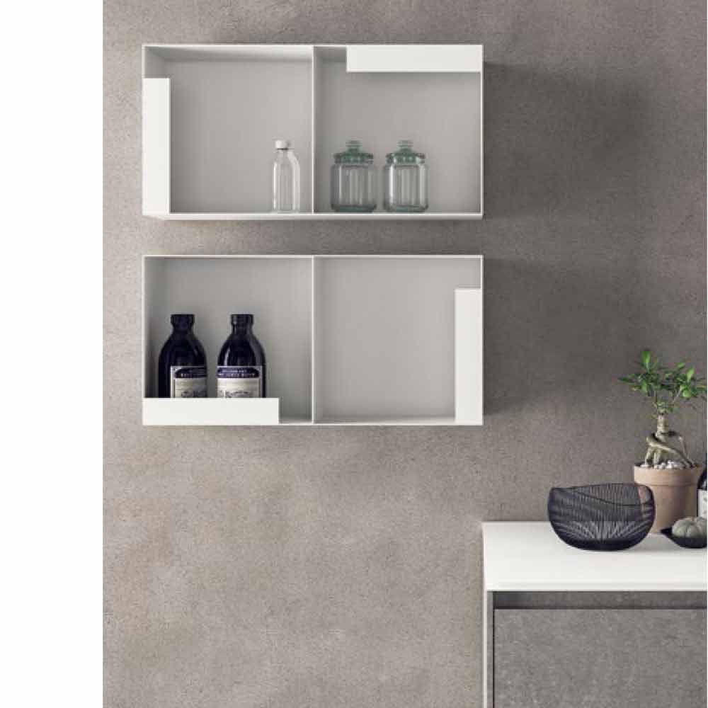 Minimal och modern badrumskomposition, upphängd design med hyllor, tillverkad i Italien.