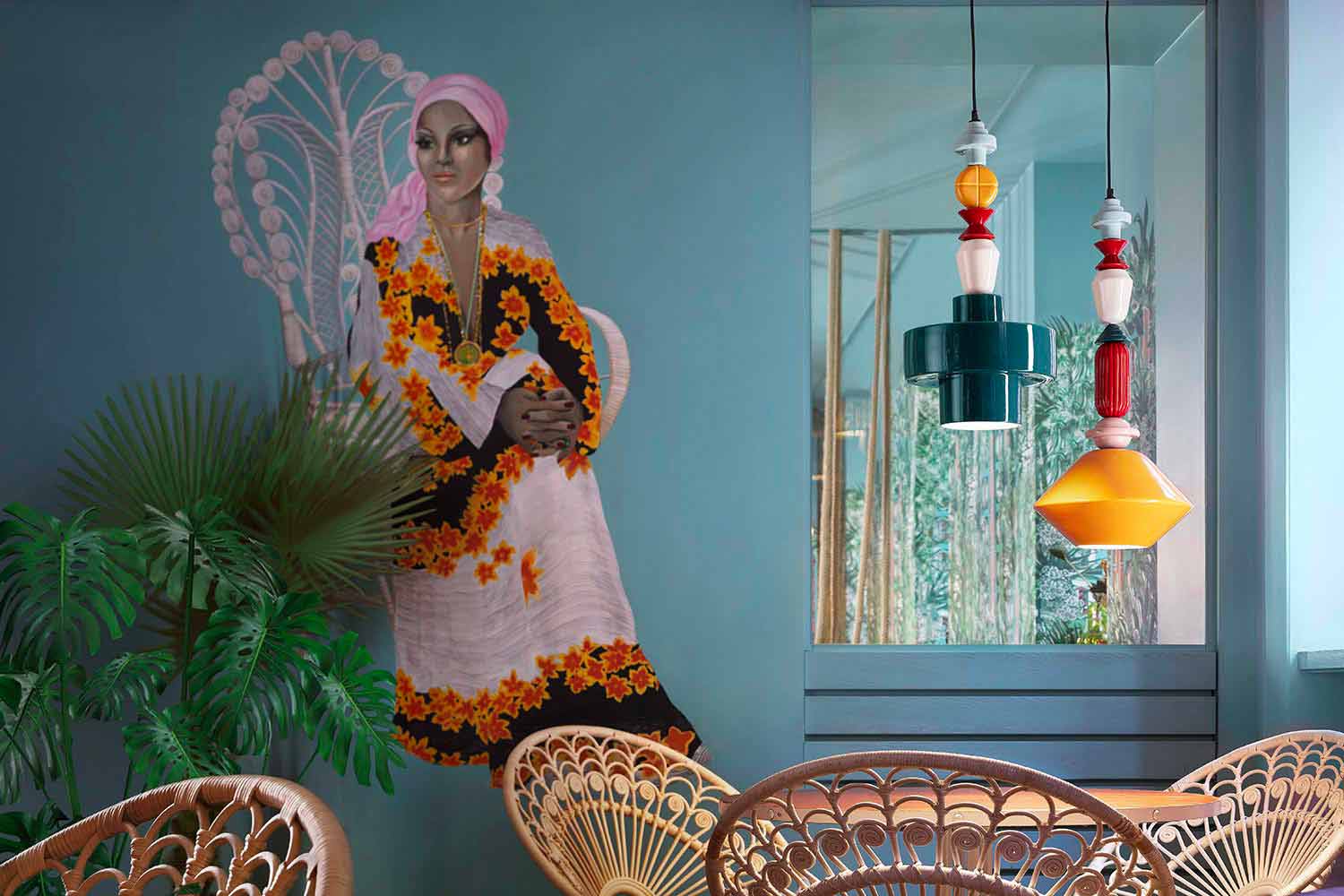 Lariat är utsmyckat med flerfärgade keramiska element som följer varandra vertikalt upp till den centrala geometriska diffusorn.
