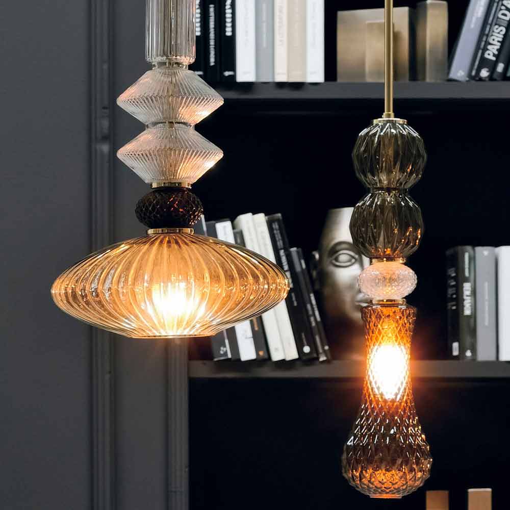 Hängande lampa gjord av Murano-glas med antik dekor, gulddetaljer och antracitkabel , Made in Italy. Mötet mellan den tidlösa elegansen i Murano-glaset och den raffinerade beröringen av de gyllene elementen ger liv till en särskilt innovativ inredningslösning, eftersom den kan föra samman modernitet och tradition för ett exklusivt och avantgardistiskt resultat som lyckas komplettera både modernt och klassiska utrymmen med personlighet. Tack vare valet att spela på geometriska former och olika ytor är det som föddes en idé om belysning med en dynamisk effekt som skapar en varm och välkomnande atmosfär samtidigt som det berikar rummets estetik.