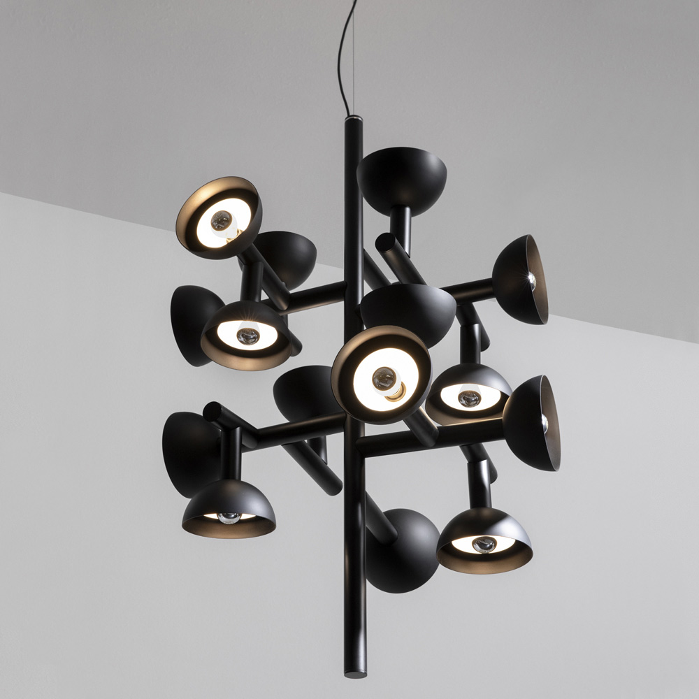 Lampan är gjord med en aluminiumstruktur av två ytbehandlingar för en helt italiensk design som genom okonventionella experiment och den kontinuerliga forskningen mellan tradition och modernitet kan förvåna, våga och upphetsa, vilket gör att du kan uttrycka dina känslor genom en originell och personlig dekorativ användning av ljus.