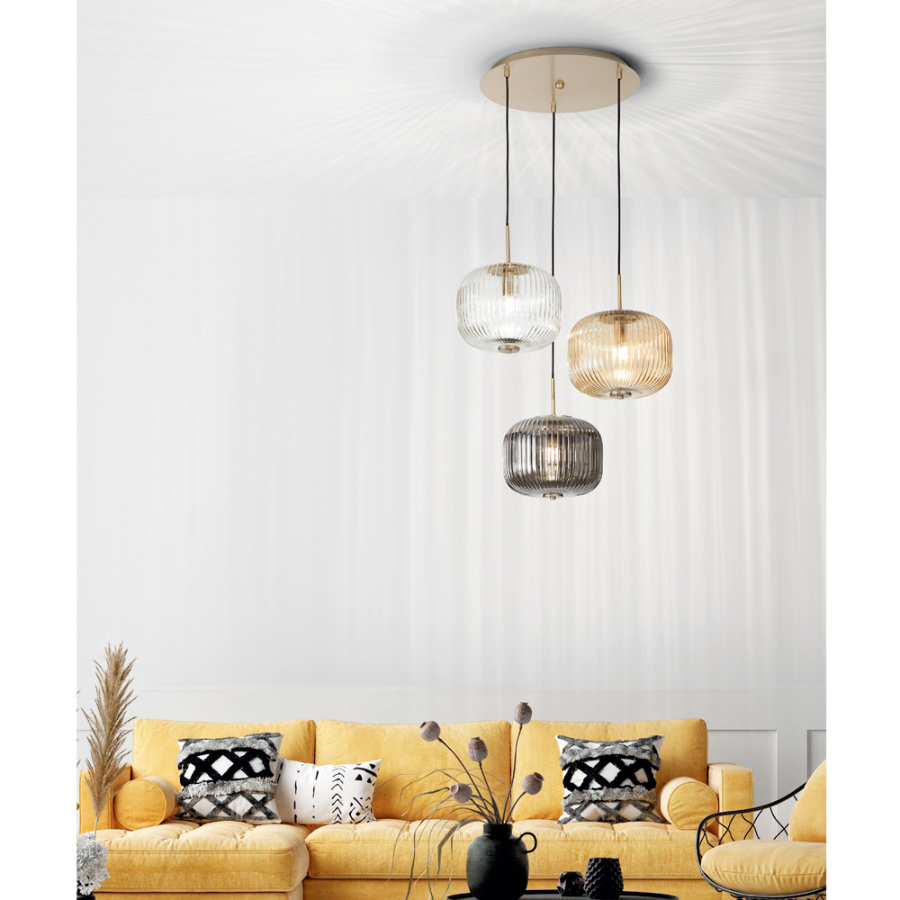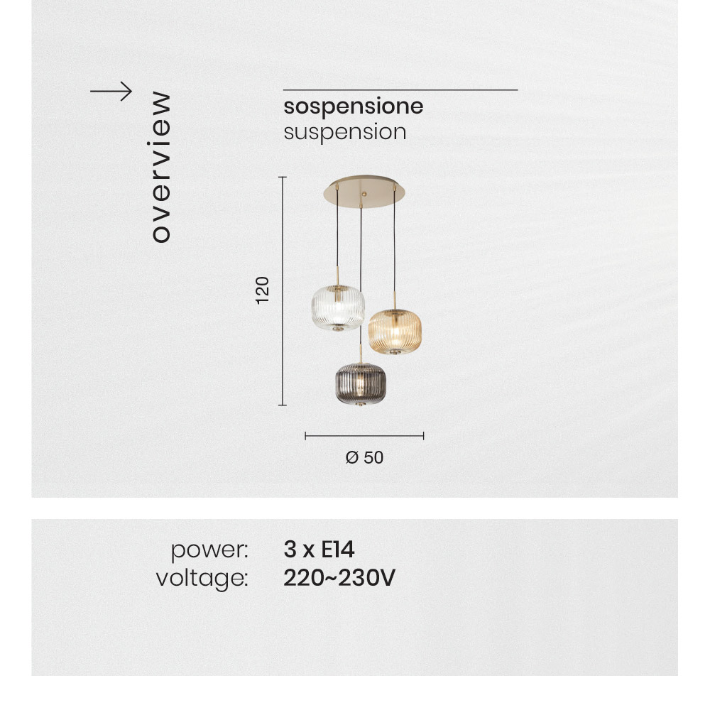 Hänglampa med guldfärgad metallstruktur och tre randiga färgade blåsta glasdiffusorer. En design som präglas av eleganta och raffinerade former som ger rummet en elegant smak, berikar dess estetik tack vare en exklusiv touch och en raffinerad och innovativ estetik . De tre underbara färgerna som understryker det blåsta glasets tidlösa elegans ger produktens slutliga utseende dess äkta delikata essens och dess starka samtida personlighet , vilket ger liv åt en inredningslösning som är lika funktionell som den är estetiskt imponerande och med en stark visuellt intryck. .