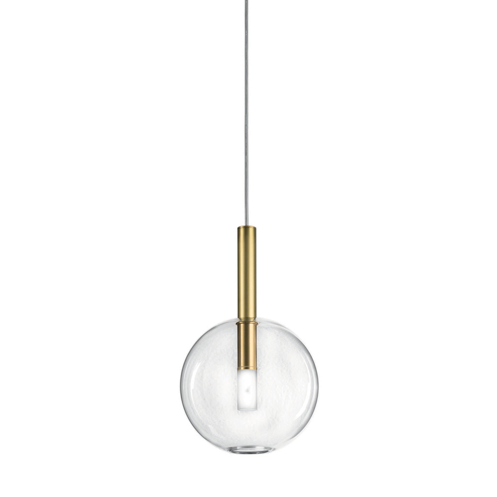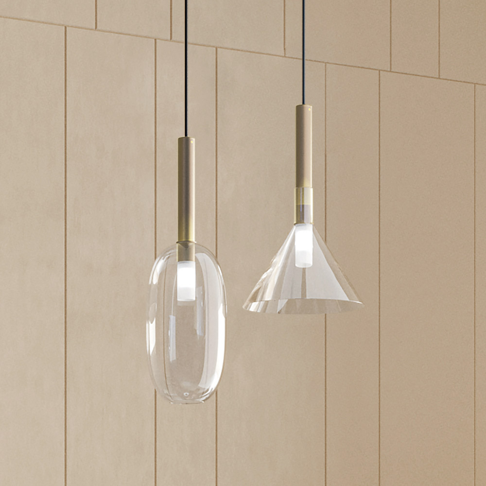 Made in Italy. Ur kombinationen av ett cylindriskt element i naturlig mässing och glasdiffusorer av olika former föds en delikat och elegant kollektion. Hänglampor som kan komponeras för att göra varje miljö unik och speciell, i en alkemi av proportioner, kombinationer, dimensioner, former och material.