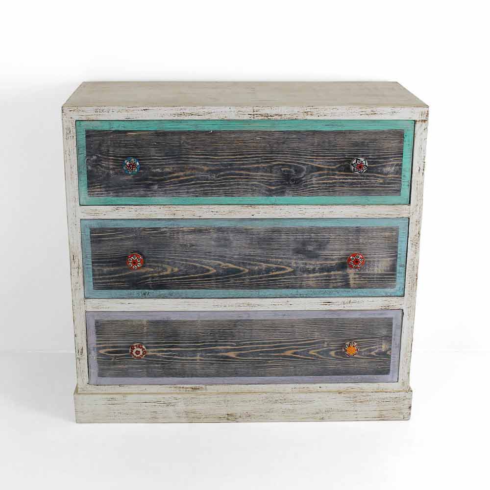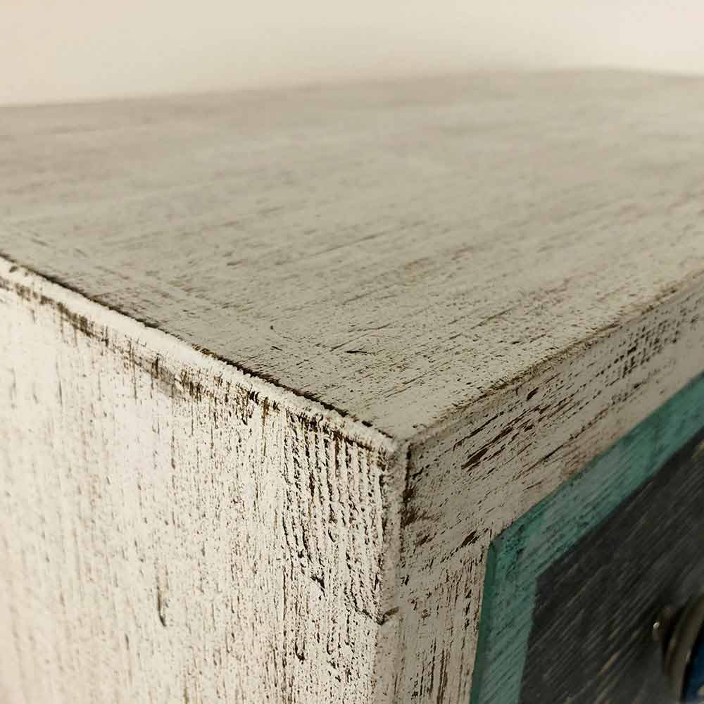 Handgjord byrå tillverkad i Italien i massivt gran med 3 lådor i poppelplywood med handmålad front och keramiska knoppar. Produktens struktur har en åldrad vit yta medan lådorna är dekorerade i flaysvart med färgade kanter. Dessa underbara färger erhålls tack vare användningen av naturmarker aggregerade med lim av animaliskt ursprung, material valda som ett alternativ till vanliga industriella färger. Detta görs i ett försök att minimera användningen av formaldehyd, ett skadligt ämne som erkänns som cancerframkallande. På detta sätt är det möjligt att sänka nivån av toxicitet, vilket skapar en funktionell och fascinerande produkt och en hälsosammare atmosfär. Byrån kompletteras äntligen med en transparent yta som gör den vattenavvisande och fixerar färgerna för att göra dem oföränderliga över tiden.