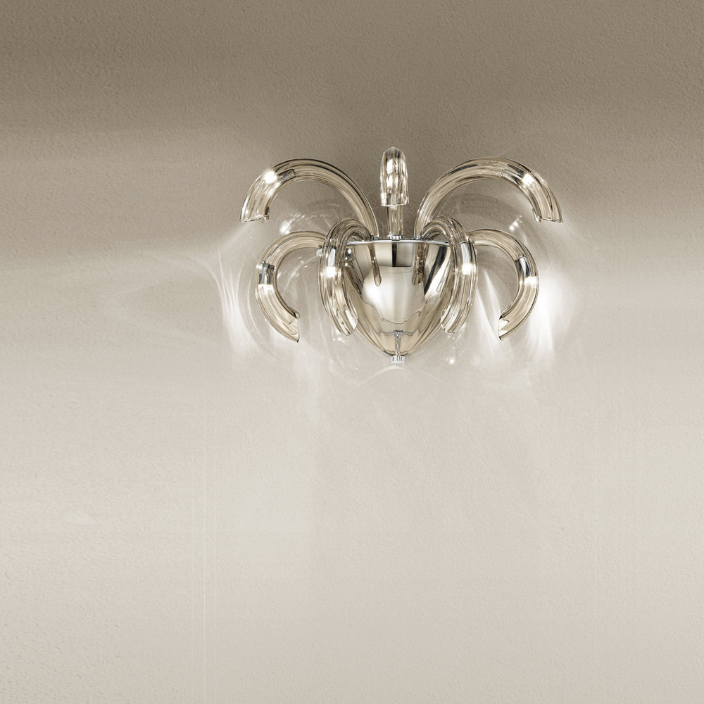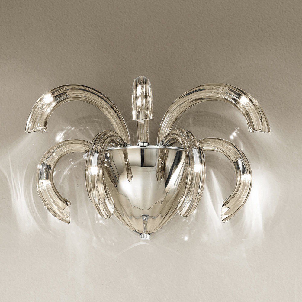 Vägglampa handgjord i Italien i Venedigglas, rökt finish med kromade metalldetaljer . En engagerande estetik som anpassar sig till alla typer av miljöer där den passar med överflöd tack vare dess former och funktionaliteten i dess design. De underbara och eleganta böjda armarna expanderar utåt för att få ljus i olika riktningar och lyser upp rummet genom en original scenografisk effekt som påminner om explosionen av fyrverkerier för ett kreativt , raffinerat och starkt visuellt effektresultat .