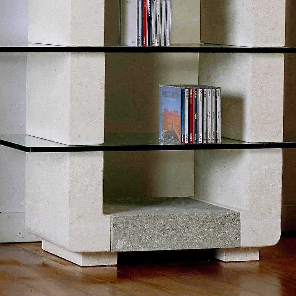 Modulär hi-fi-dörr Tillverkad i Italien , gjord med kombinationen av vit och grå Vicenza sten och 12 mm tjocka glashylsor. Väsentligheten i formen och kombinationen av materialen gör det till ett modernt och funktionellt föremål som passar för minimalistiska möbler. Stenarna behandlas med ett impregneringsvatten tvättbart och miljövänligt för enkel rengöring.