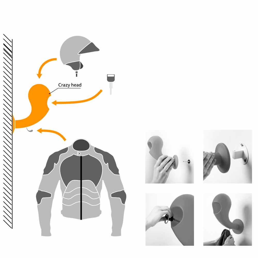 En absolut nyhet, Crazy Head- hjälmhållaren är avsedd att bli ett oumbärligt måste i motorcykel-, skoter- och cykelentusiasternas hem. Föreslagen av Myyour som en original och rolig möbel, förvandlar den dess funktionalitet till multifunktionalitet tack vare det praktiska ficktömningsfacket och den praktiska klädhängaren. Den kan också användas som en innovativ och snygg hatthållare.