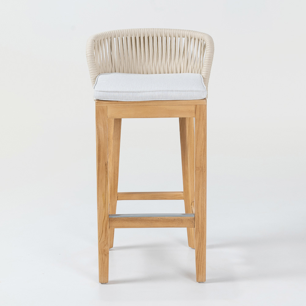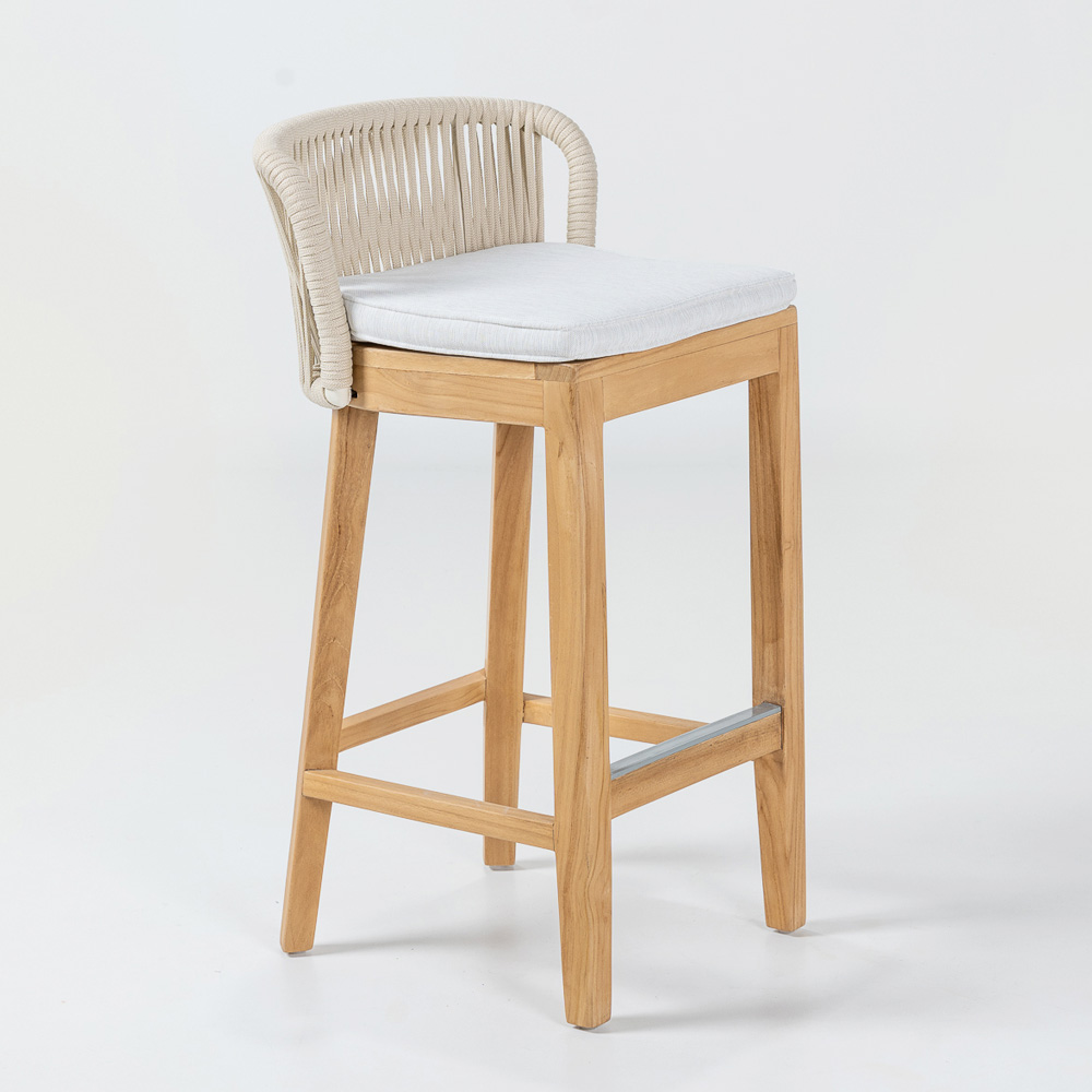 Denna barstol är elegant och mångsidig och har en ram i naturfärgad teak och aluminium , vilket garanterar den perfekta kombinationen av styrka och lätthet . Den havannagrå tygdynan erbjuder utmärkt komfort, medan repvävningen i olefin/PP inte bara ger en touch av sofistikering utan också är väderbeständig, vilket gör den idealisk för både inomhus- och utomhusbruk.