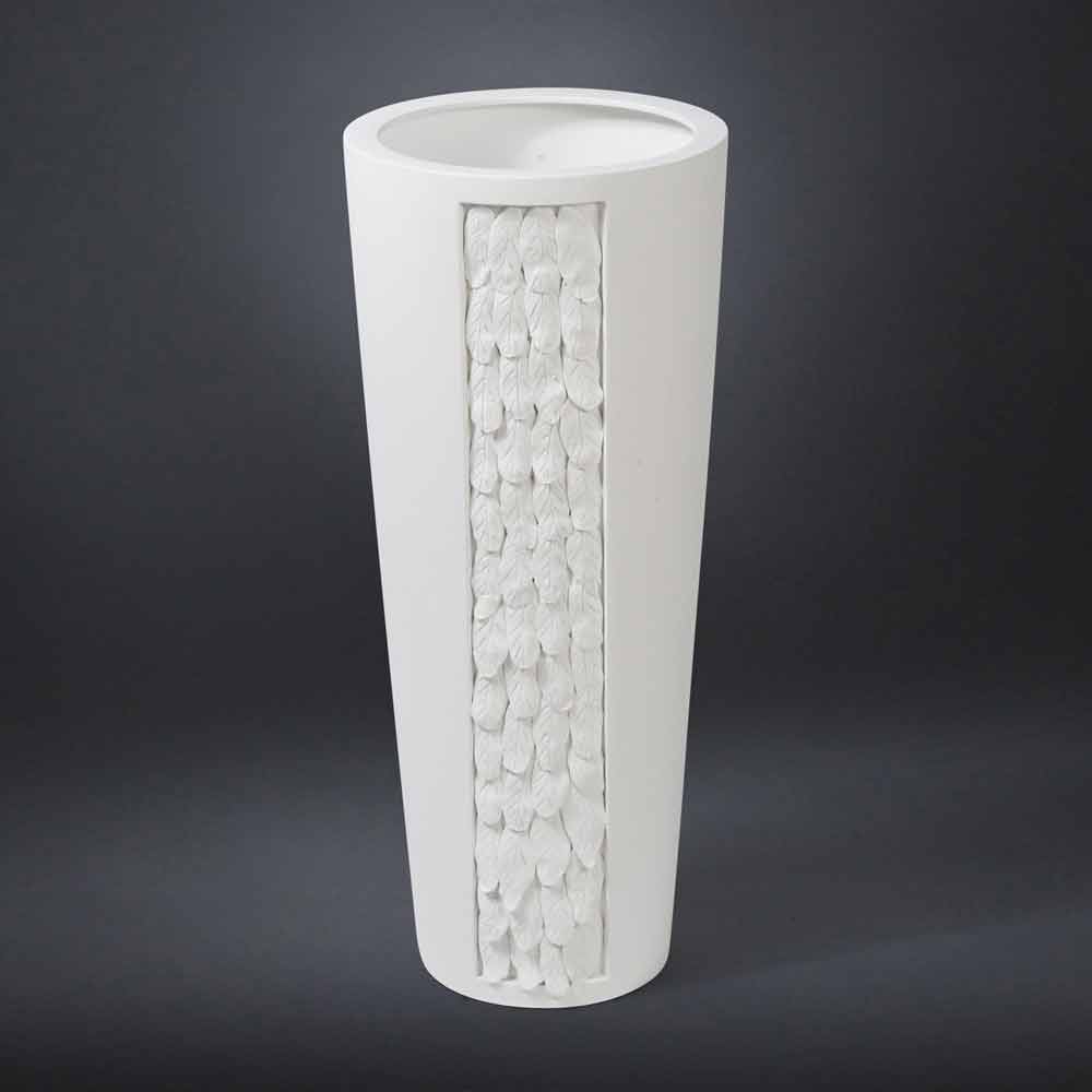 Hög vas för inredning tillverkad i Italien i ogenomskinlig vit keramik genom en hantverksprocess . En estetik som präglas av väsentliga former berikad med en elegant detalj med en bladstruktur som täcker en del av vasens struktur. Denna detalj tillsammans med den valda raffinerade finishen ger detta komplement all sin personlighet vilket gör den till en perfekt lösning för utrymmen som präglas av en stilren stil . Användningen av keramik och hantverk gör det till ett exklusivt och förfinat dekorativt element som ökar dess värde och betonar dess kvalitet. En idealisk estetik för de mest varierade miljöerna, från heminredning till hotell, restauranger, kontraktsområden, spa men också som en miljö för evenemang och bröllop.