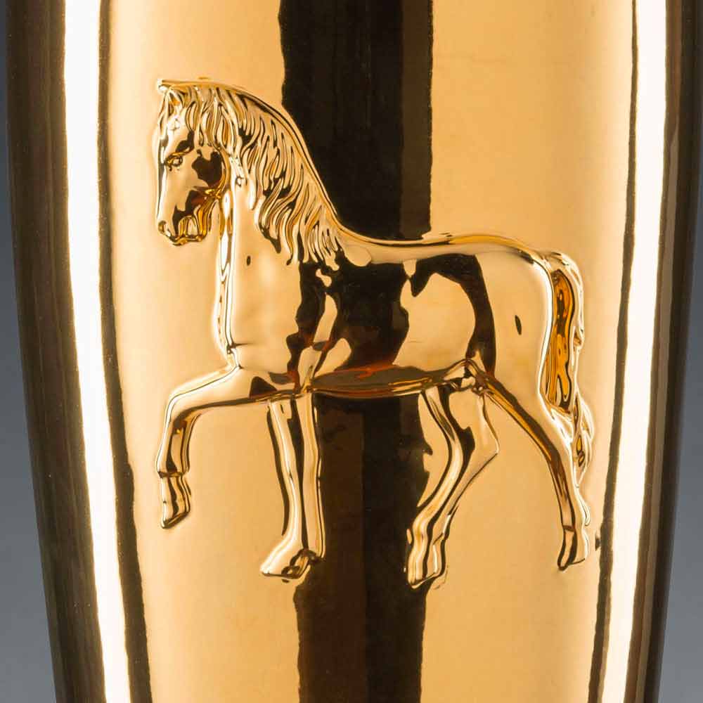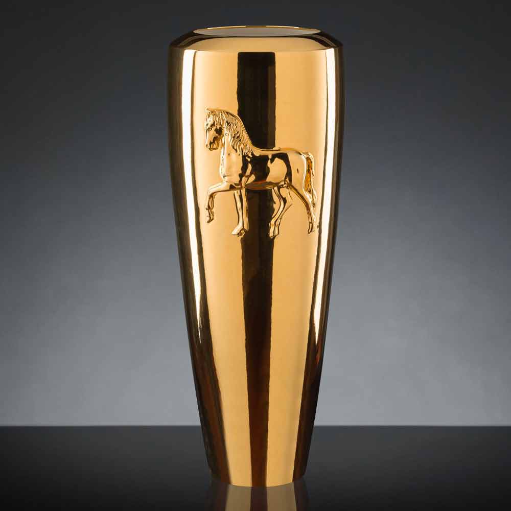Hög dekorativ vas gjord av keramik med en blank 24k guldfinish handgjorda i Italien av hantverkare som har varit experter inom branschen i generationer. En enastående möbel vars struktur präglas av enkla former berikade av frontdekorationen som betonar dess unika egenskaper. Den speciella valda färgen gör den också extremt elegant och kan komplettera de omgivande möblerna med personlighet. Användningen av keramik och hantverk ökar dess värde och värde för att ge ett exklusivt och högkvalitativt liv. En idealisk design för de mest varierade miljöerna, från heminredning till hotell, restauranger, kontraktsområden, spa men också som en miljö för evenemang och bröllop.