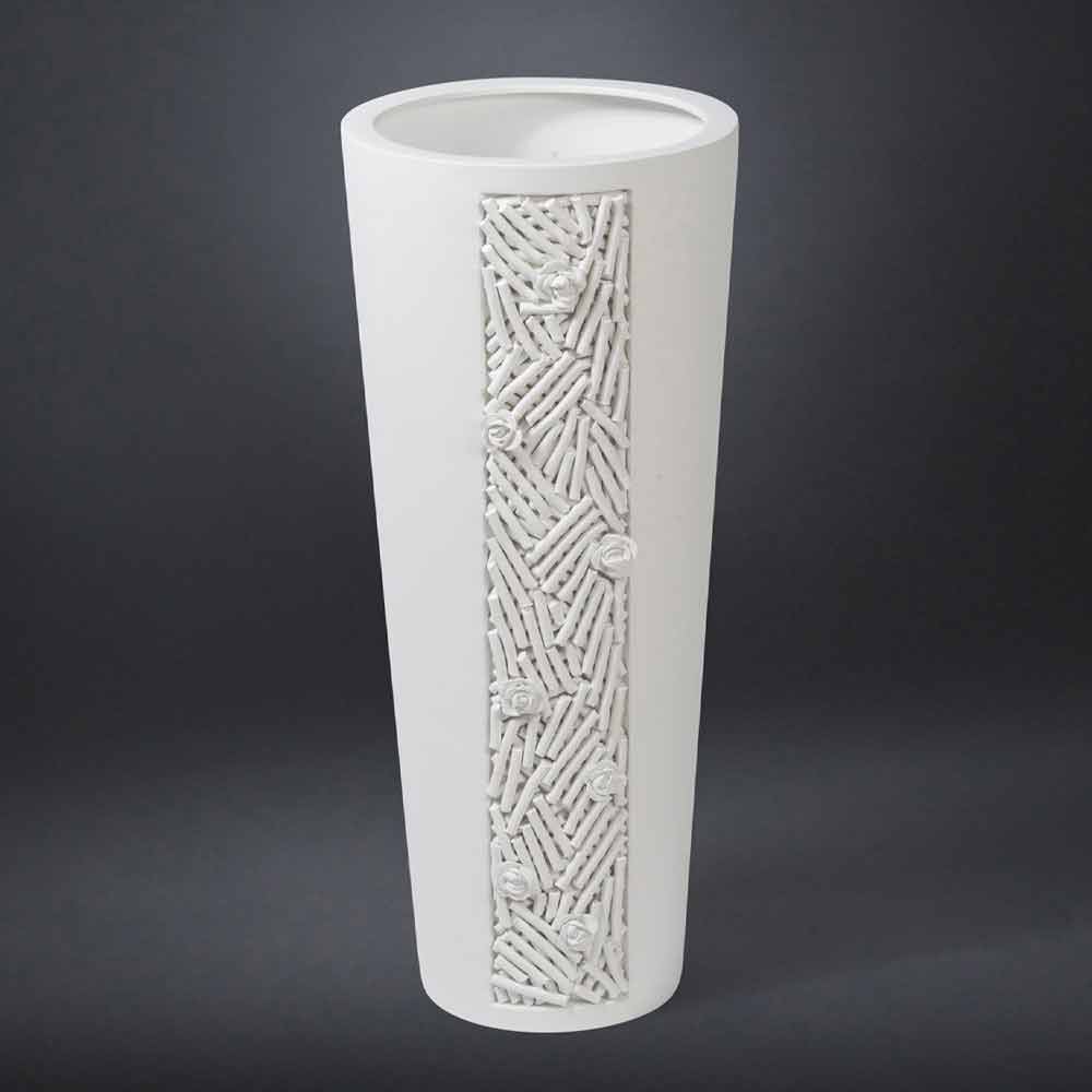 Hög dekorativ vas tillverkad i Italien i ogenomskinlig vit keramik genom hantverk . En enkel och väsentlig stil kompletterad och berikad med en raffinerad detalj med en loggstruktur som kännetecknar en del av vasens struktur vilket gör den unik och original. Denna detalj tillsammans med den valda eleganta finishen ger detta komplement all sin eklektiska personlighet vilket gör den till en perfekt lösning för utrymmen som präglas av en stilren stil . Användningen av keramik och hantverk gör det till ett exklusivt och förfinat dekorativt element som ökar dess värde och betonar dess kvalitet. En idealisk estetik för de mest varierade miljöerna, från heminredning till hotell, restauranger, kontraktsområden, spa men också som en miljö för evenemang och bröllop.