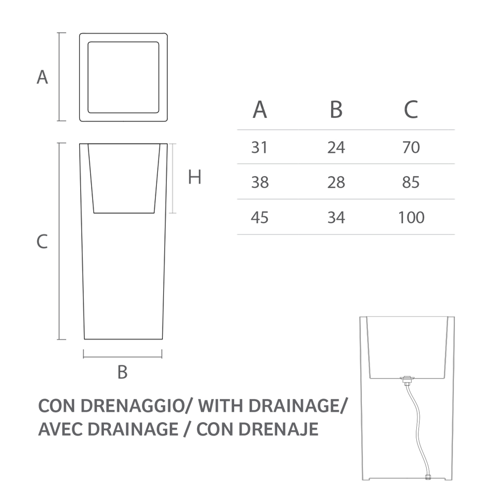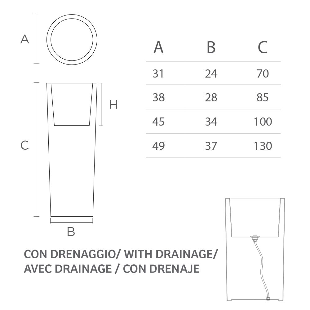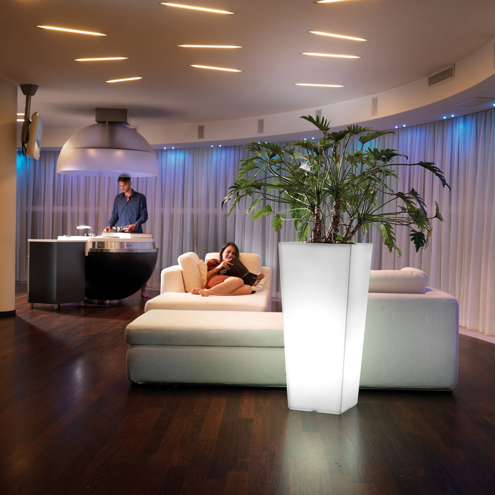 Strukturen inkluderar ett vattendräneringssats för att låta denna vas dekorera inomhus- och utomhusområden utan att offra den praktiska och funktionella aspekten. Slutligen är denna inomhusvas utrustad med ett integrerat LED-ljus för att ge en extra touch av stil till inomhusutrymmen men även till utomhusmiljöer under evenemang.