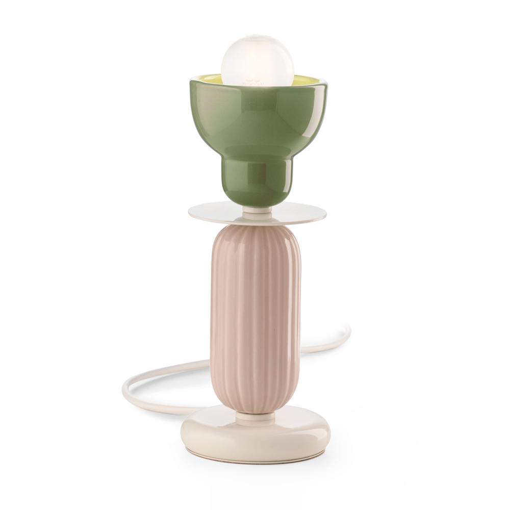 Denna bordslampa är en sann ljusskulptur , en pjäs som kombinerar djärv design och ljusa färger .