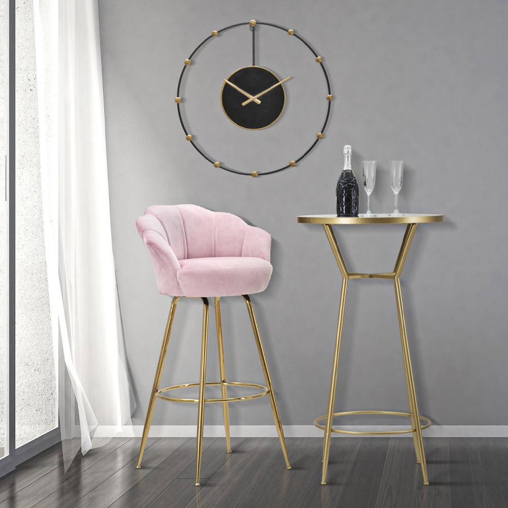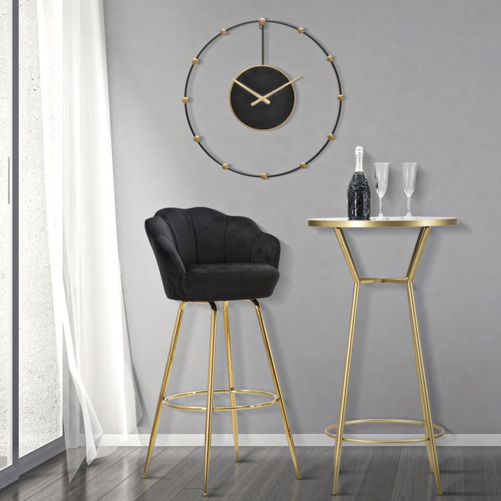 Hög barstol i förgyllt järn med säte täckt i tyg.