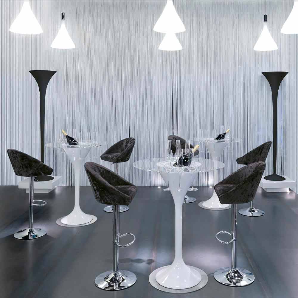 Hög pall perfekt för bar- eller köksbänkar tillverkade helt i Italien med förkromad stålkonstruktion , plywoodskal, vaddering i polyuretanskum med öppen cell med olika densiteter och sammetskläder. Design och funktionalitet går samman för att ge liv åt denna underbara och eleganta möbel som kännetecknas av mjuka former och linjer som sammanflätas för att skapa ett bekvämt och omslutande säte som är perfekt för vardagsrum eller kontraktytor med en modern och raffinerad stil . Dess särdrag representeras av den justerbara lyften som maximerar pallens funktionalitet tillsammans med det praktiska fotstödet som gör att du kan behålla en bekväm och välkomnande position . Det som föds är därför ett raffinerat inredningstillbehör som förkroppsligar komfort och design tack vare 100% tillverkning i Italien och användningen av kvalitetsråvaror som betonar värdet och värdet av denna eleganta pall.