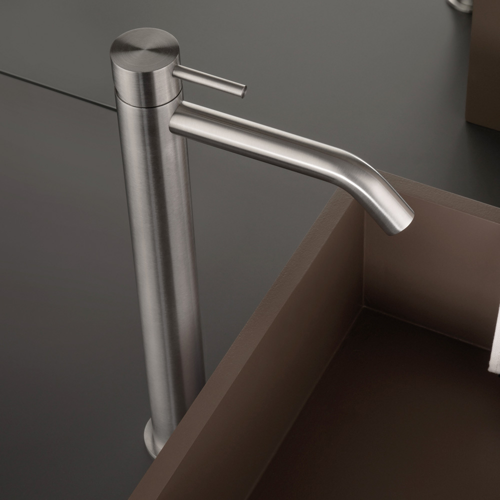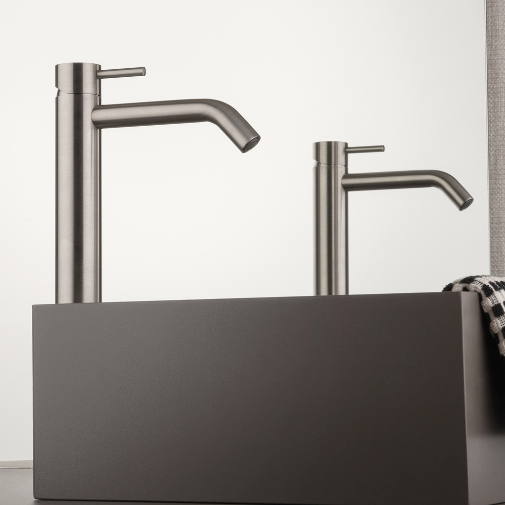 Denna höga tvättställsblandare med lång pip utmärker sig för sin slanka och moderna design, perfekt för att lägga till en touch av elegans till de mest moderna tvättställen. Den rostfria finishen ger inte bara ett raffinerat utseende utan garanterar också hållbarhet och enkelt underhåll.