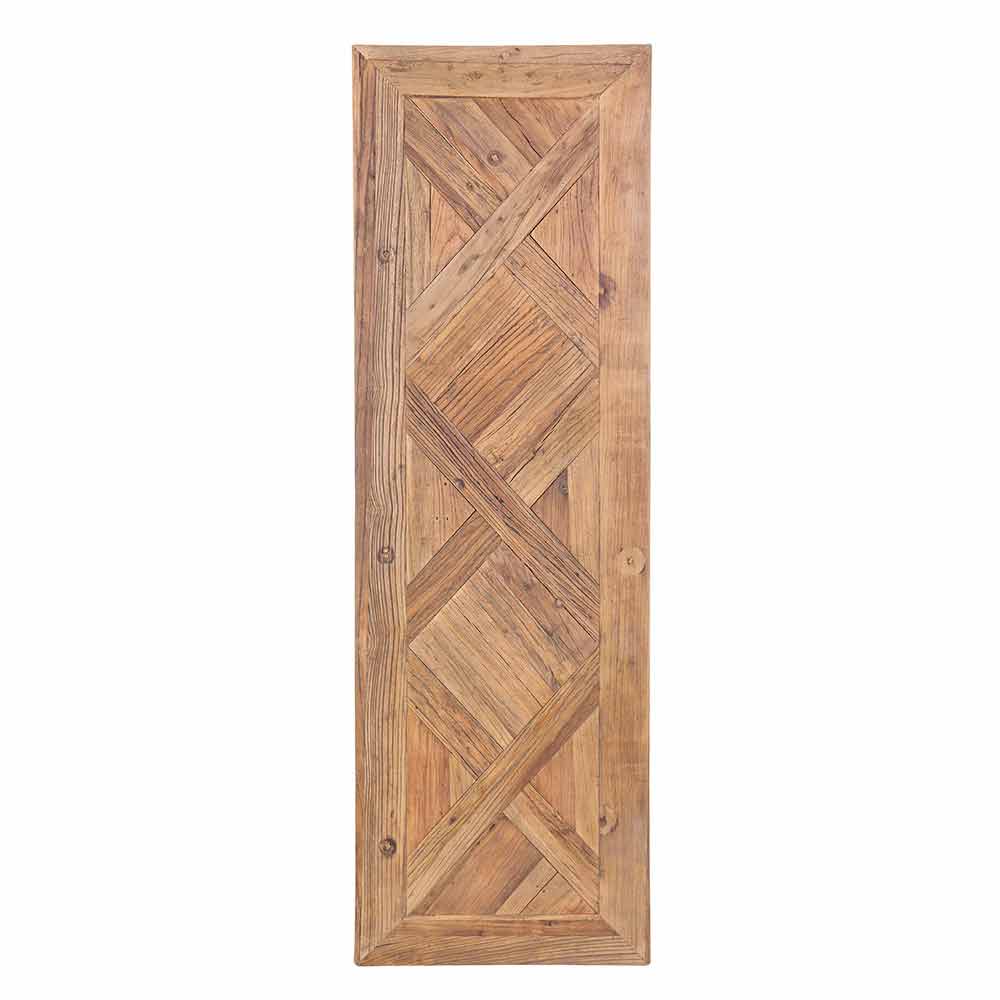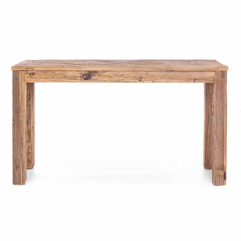 Denna designkonsol är helt och hållet gjord av återvunnet almträ, med toppen dekorerad med en åldrad parkettfinish och en nitrocellulosabaserad yta.