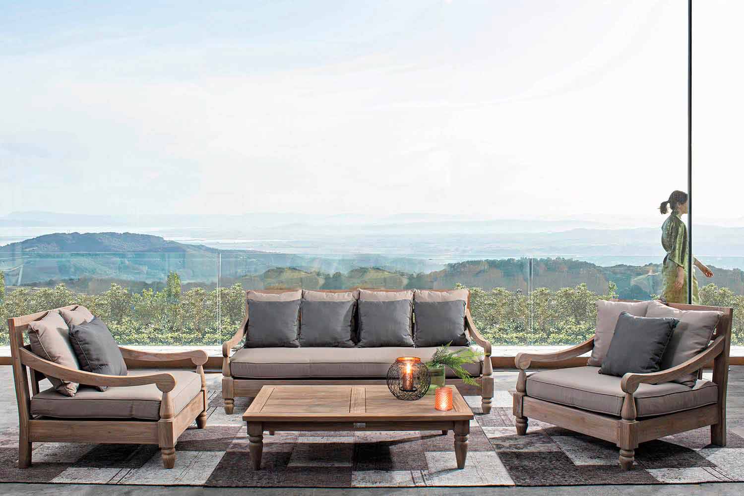 100% FSC teakträ, sandblästrad och åldrig vattenbaserad finish. Avtagbara kuddar med soltät olefintyg (100% polypropen).