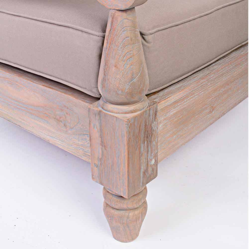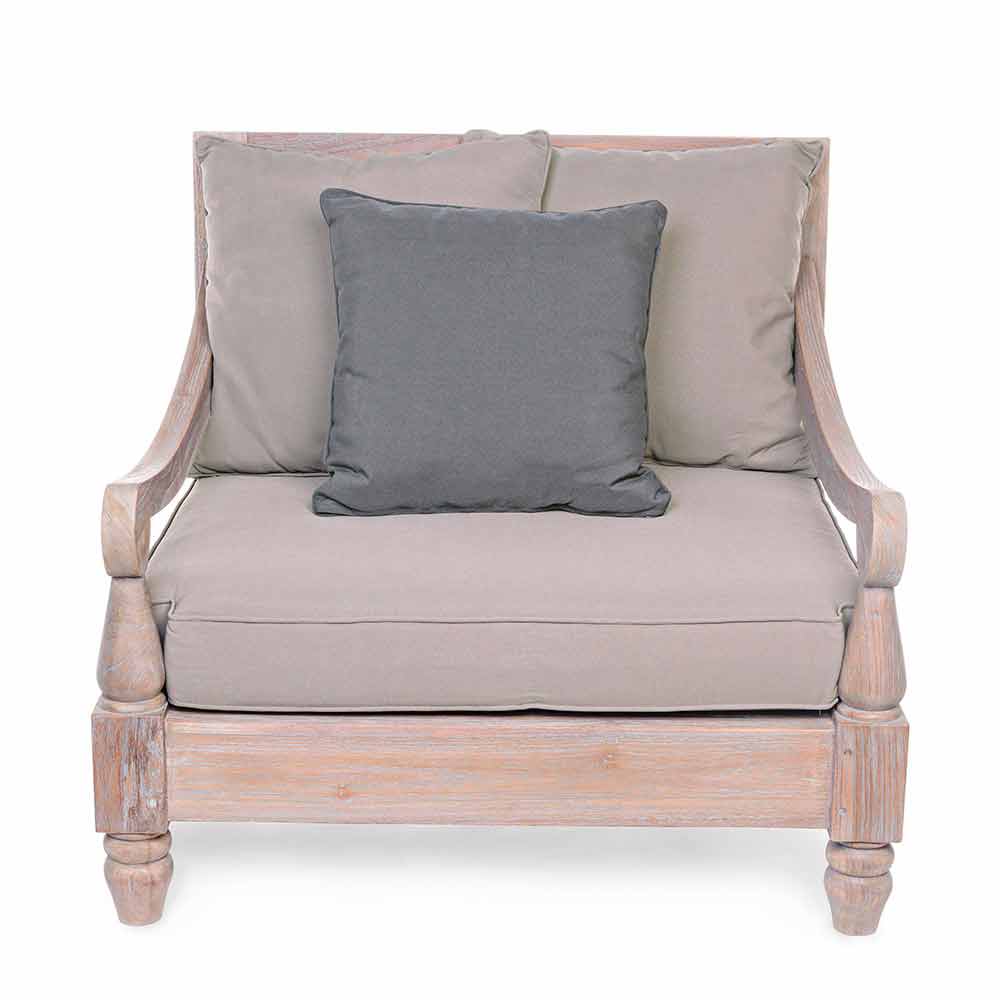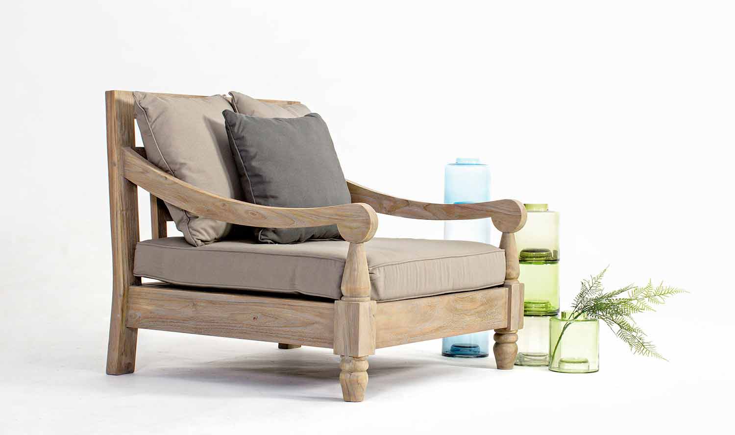 Utomhus fåtölj i rustik stil, tillverkad av teak trä, med avtagbara tygkuddar.