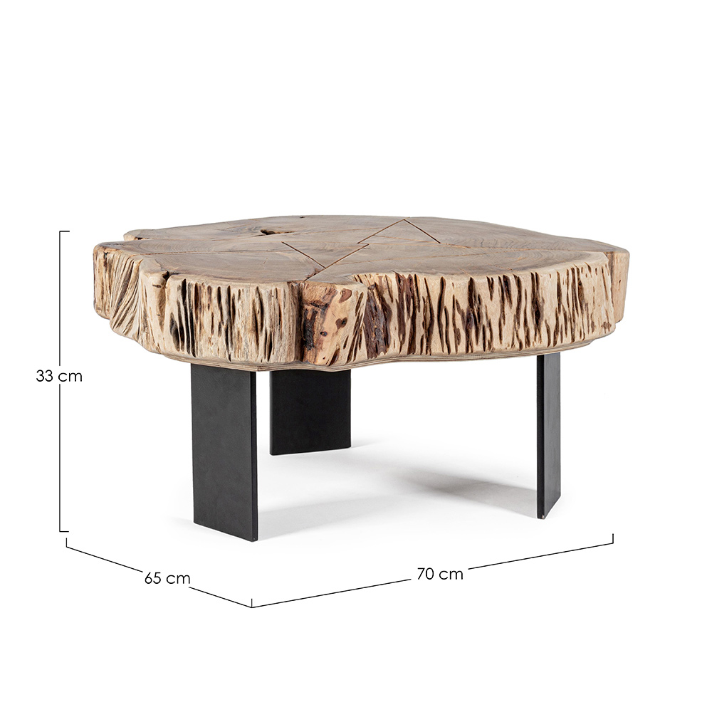 Lågt bord för vardagsrummet i stål och stam av naturligt akaciaträ.