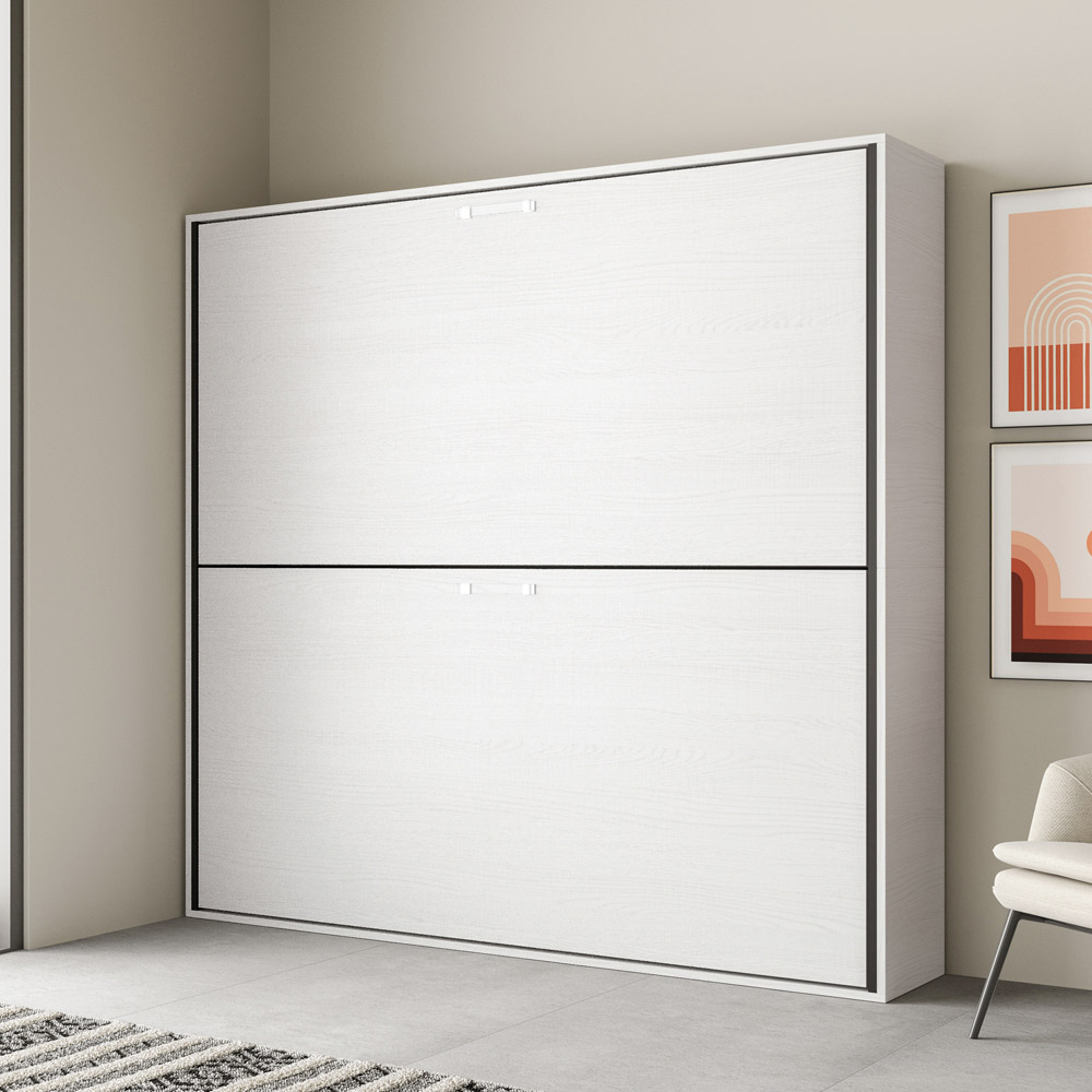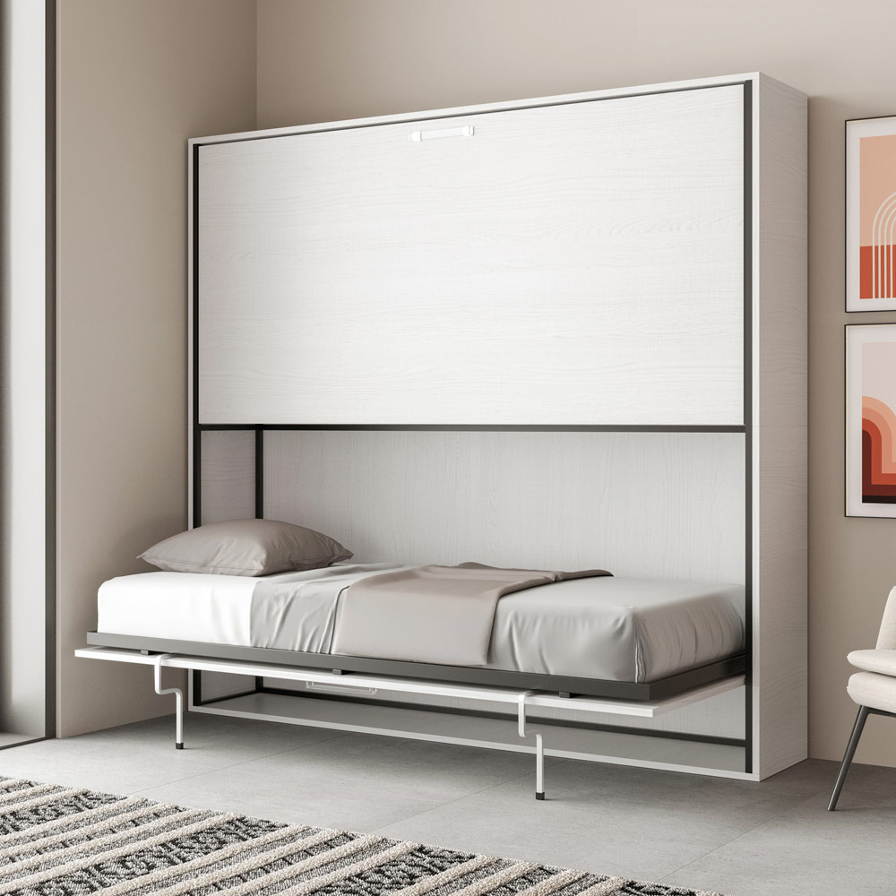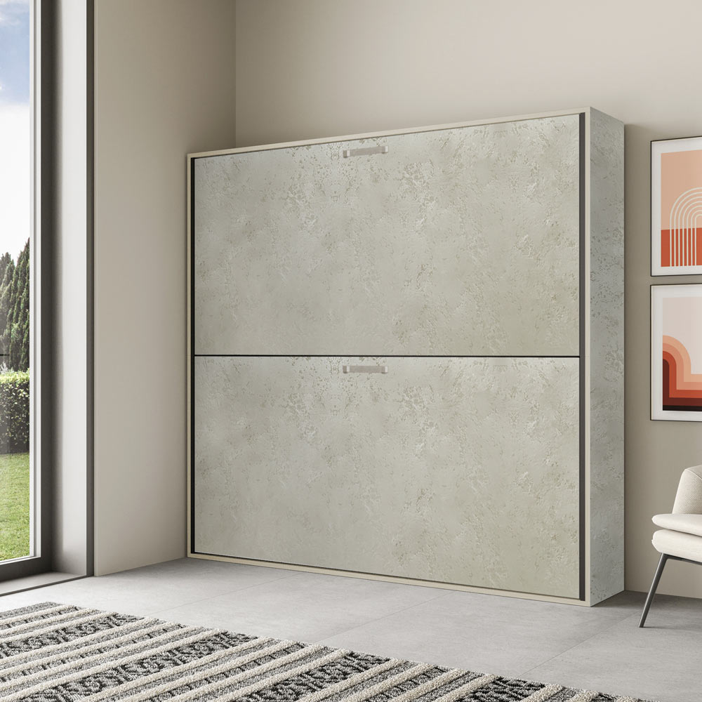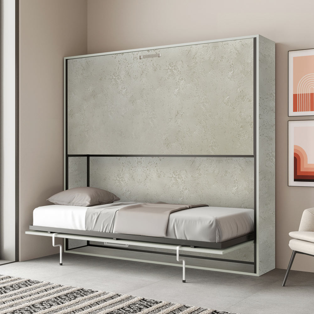 Horisontell hopfällbar säng tillverkad med en struktur av 18 mm tjocka förädlade spånskivor, sängbotten i armerat järn målad med epoxipulver i präglad aluminiumfärg.