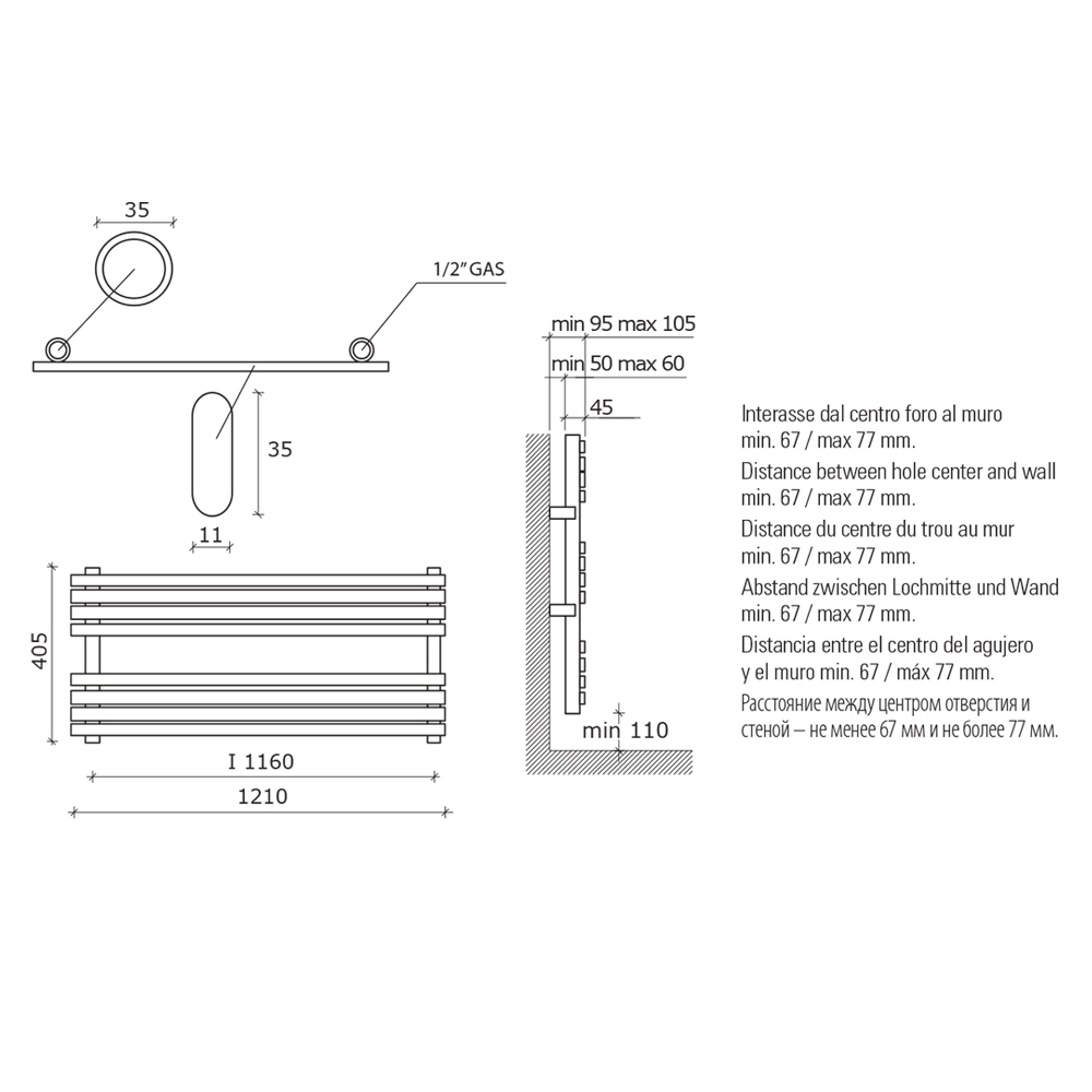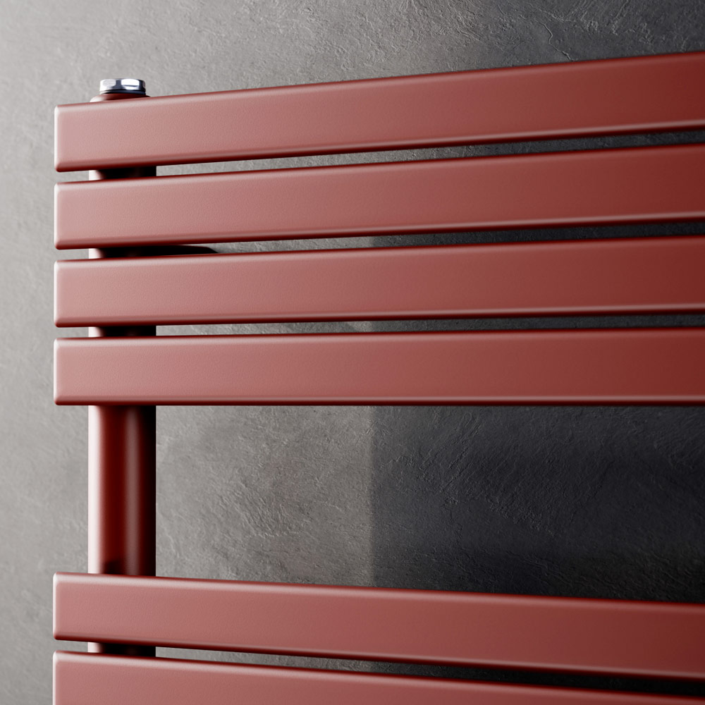 Hydraulisk handdukstork av kolstål med matt rostfinish, bestående av 35x11 mm horisontella platta rör och 35 mm diameter grenrör, helt Made in Italy.