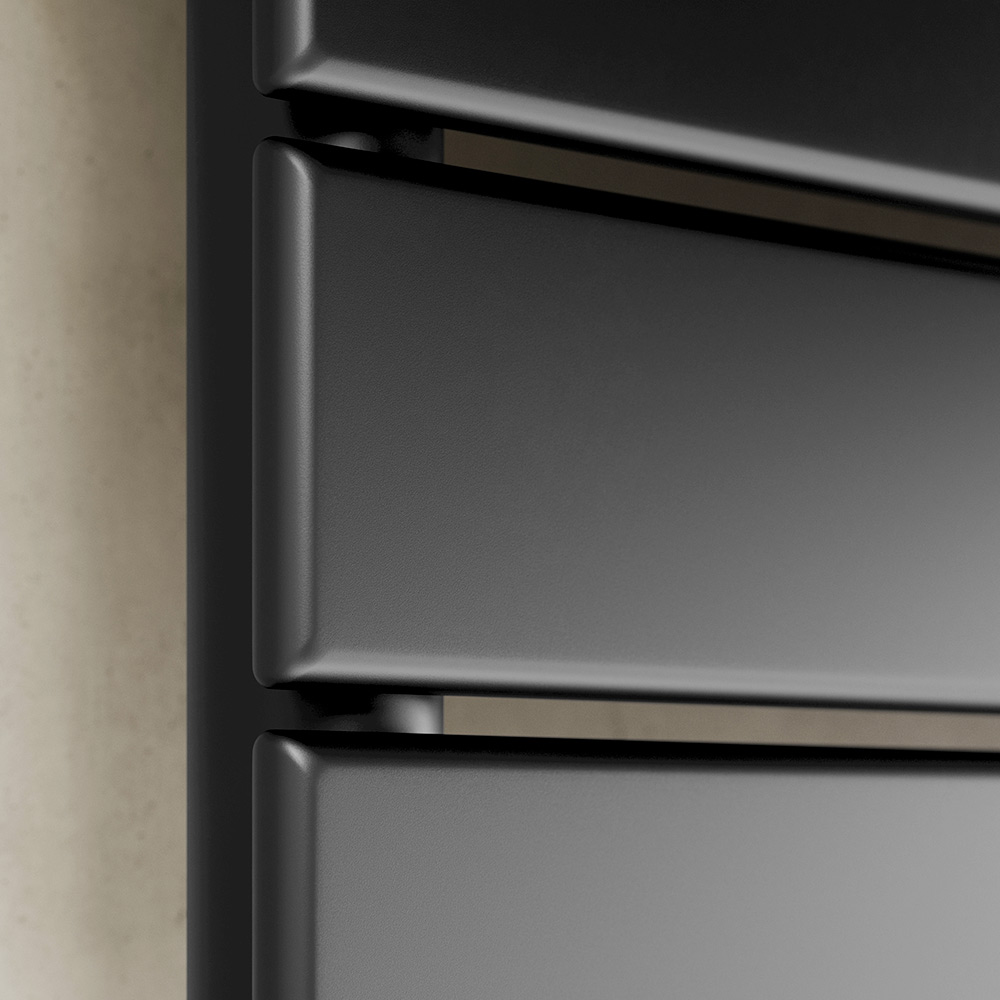 Denna svarta handdukstorkare representerar ren elegans och sofistikering i varje detalj. Dess moderna design och rena geometriska linjer ger en touch av modern stil till alla badrum, och integreras perfekt med olika inredningsstilar, från de mest minimalistiska till de mest vågade.