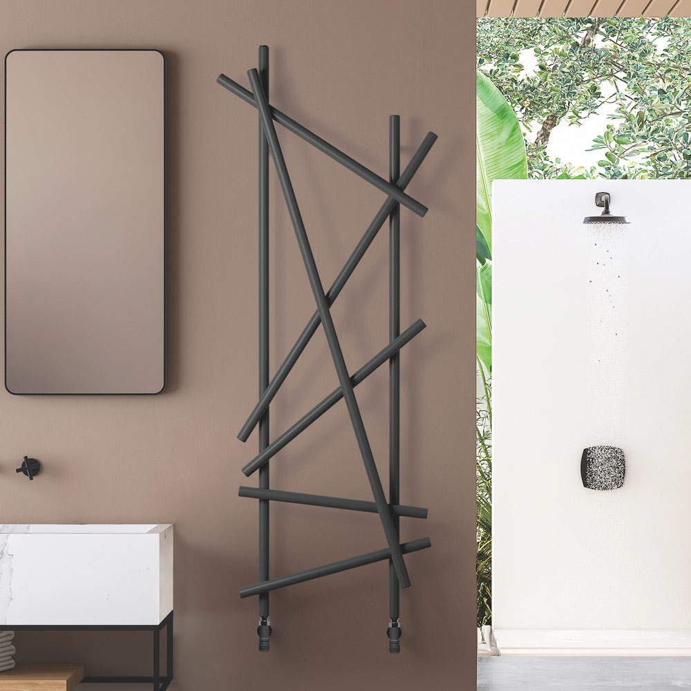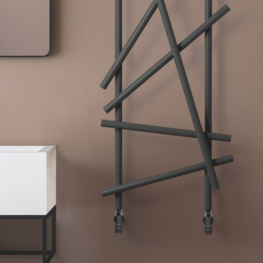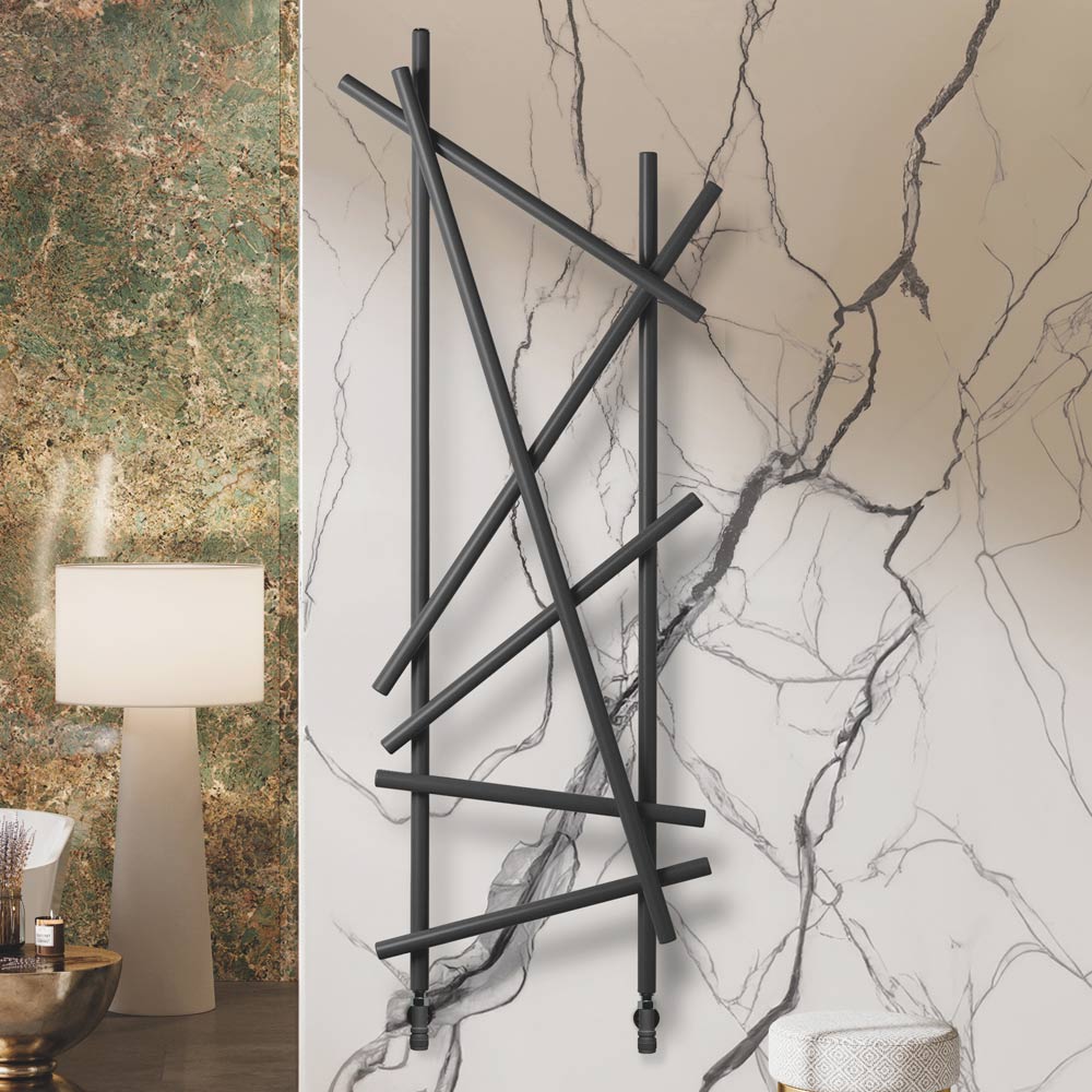 Denna stålradiator utmärker sig för sin innovativa och konstnärliga design, idealisk för dem som letar efter ett funktionellt element med en stark estetisk påverkan på sin miljö. De oregelbundna och korsade linjerna maximerar inte bara spridningen av värme utan förvandlar också värmaren till ett verk av väggkonst. Den mattsvarta finishen ger en touch av modernitet och klass, och integreras perfekt med alla färgscheman och inredningsdesigner, vilket framgår av de eleganta marmorväggarna och metalliska accenterna i den omgivande miljön.