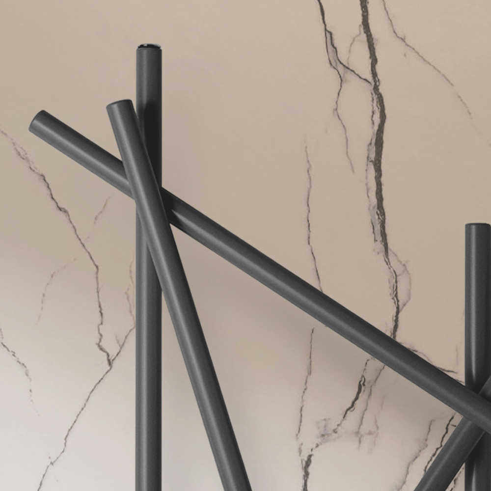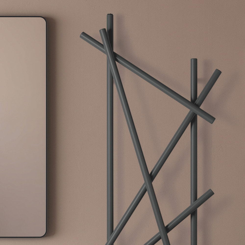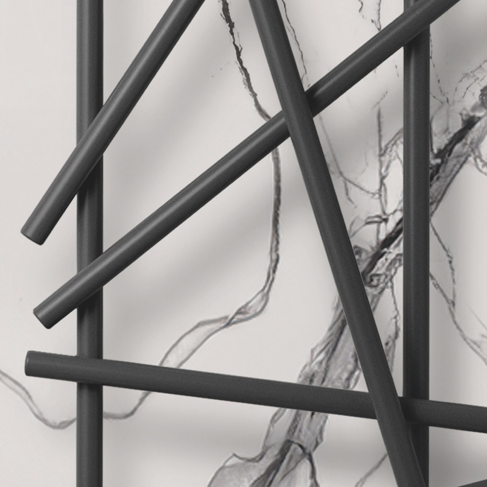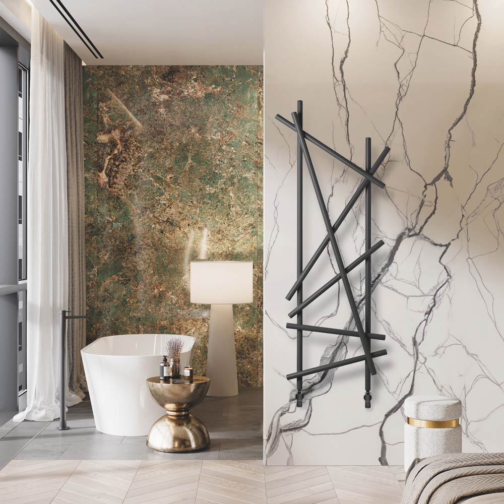Denna stålradiator utmärker sig för sin innovativa och konstnärliga design, idealisk för dem som letar efter ett funktionellt element med en stark estetisk påverkan på sin miljö. De oregelbundna och korsade linjerna maximerar inte bara spridningen av värme utan förvandlar också värmaren till ett verk av väggkonst. Den mattsvarta finishen ger en touch av modernitet och klass, och integreras perfekt med alla färgscheman och inredningsdesigner, vilket framgår av de eleganta marmorväggarna och metalliska accenterna i den omgivande miljön.
