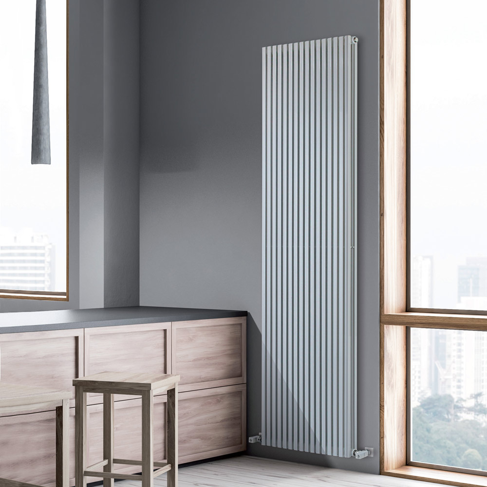 Hydraulisk radiator i kolstål med en ren vit blank yta bestående av en dubbel serie vertikala element med 2 cm kvadratisk sektion svetsade på horisontella grenrör med 3,5 cm diameter, helt tillverkade i Italieninklusive väggfäste, avluftningsventil och blindkåpa . Hela produktionsprocessen sker i en fabrik nära Treviso, bara några kilometer från Venedig, där kvalitet är ett ständigt mål . Kvalitet är synonymt med noggrann uppmärksamhet på detaljer och val av de mest pålitliga materialen. Det är så radiatorer med största möjliga renhet i design och funktionalitet skapas.