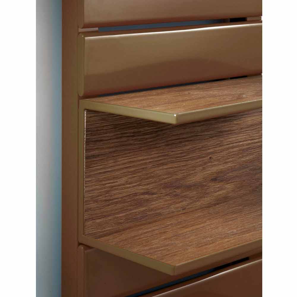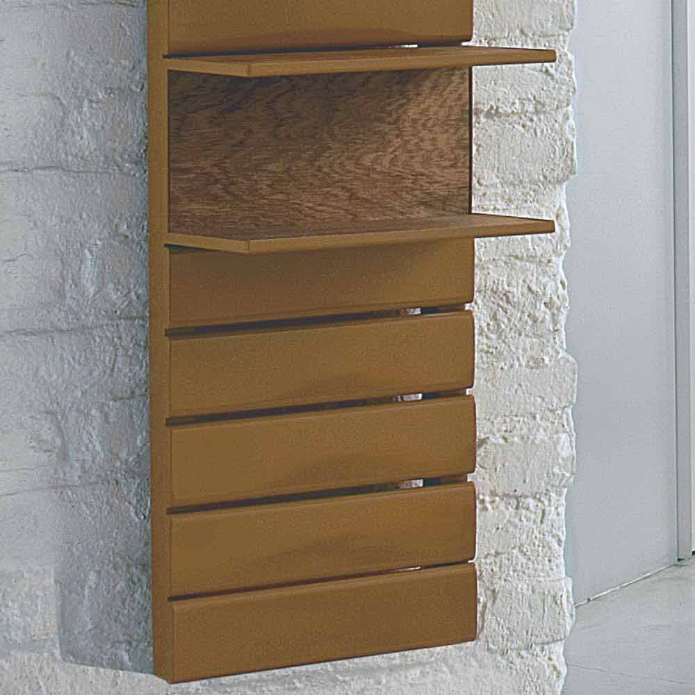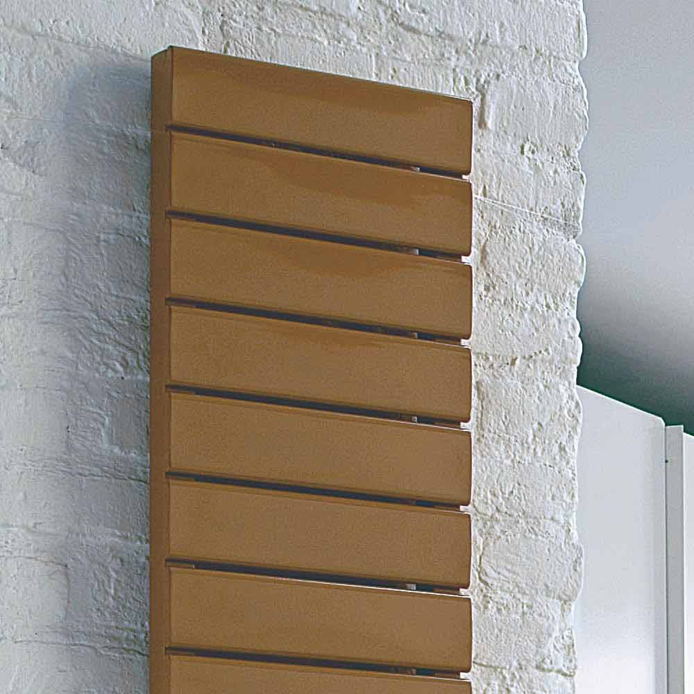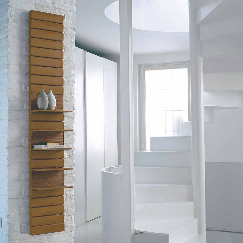 Hydraulisk radiator, praktisk och funktionell med linjär design, värmer och organiserar varje miljö där den sätts in. Vertikal kylare i färgat stål, komplett med hyllor (som visas på bilden) med ryggstödshyllor och topp i naturlig ek.